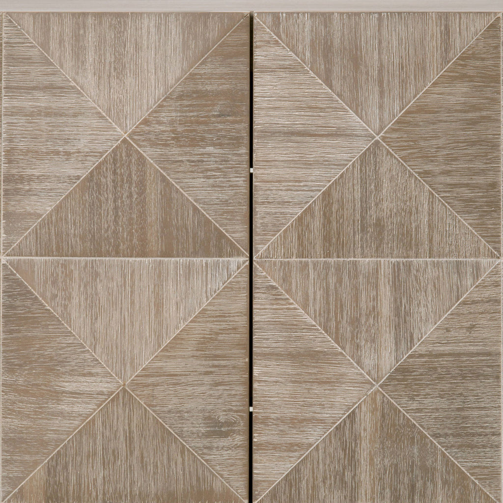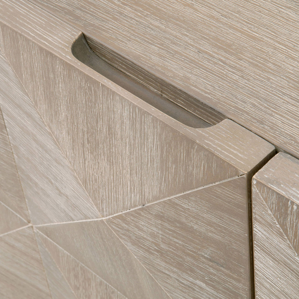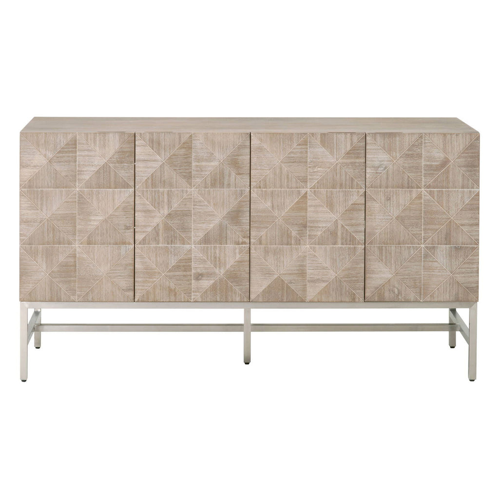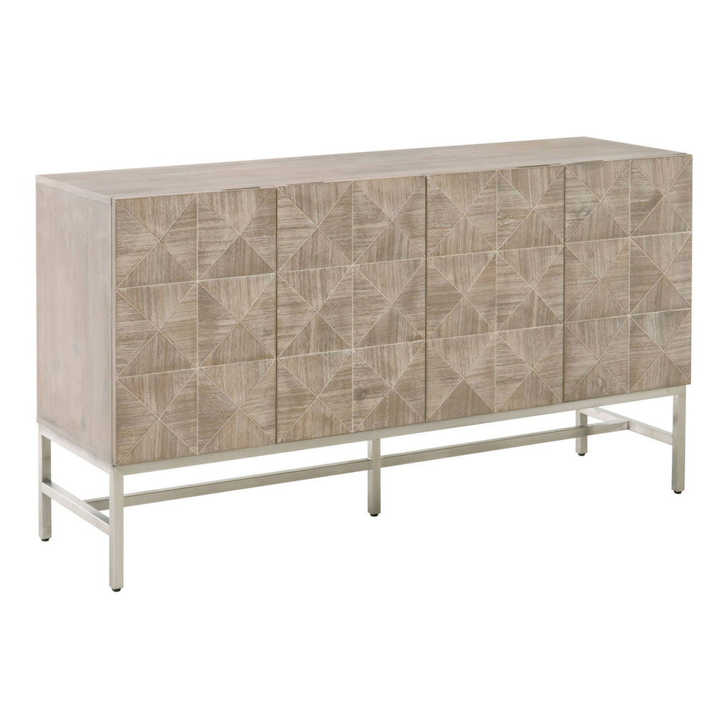 The Atlas media sideboard in transitional style featuring Raised Diamond pattern door panels and Natural Gray finish with Brushed Stainless Steel base. Tradition Collection's Acacia Veneer finish is sandblasted to create a rustic appearance. This process accentuates the natural grain of the wood and creates a variation in both color and texture. The existence of natural knots, cracks, scratches, and marks in the surface of the wood should be expected.