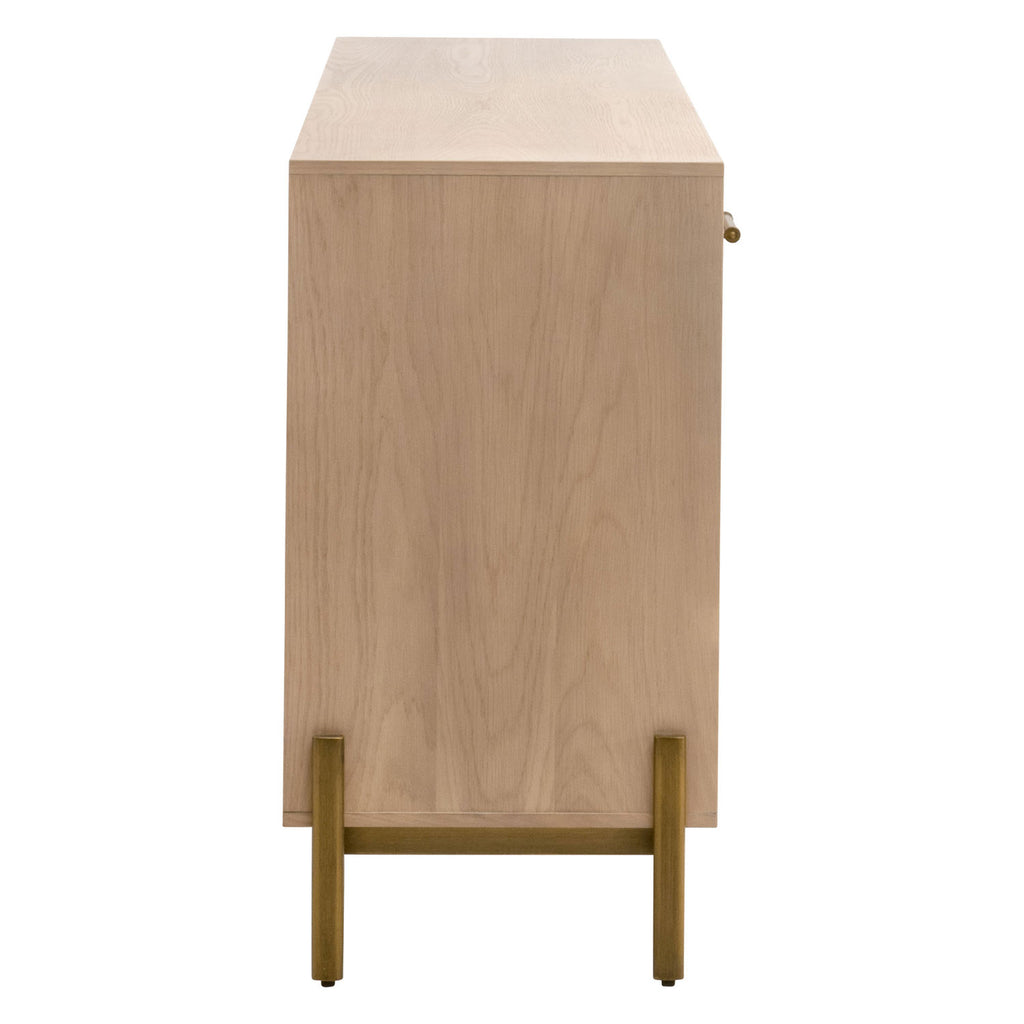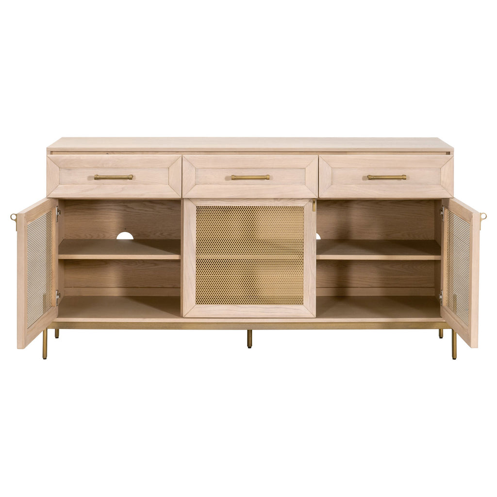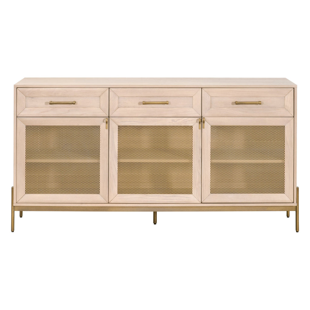 The multi-purpose Essentials for Living Dwell media sideboard was designed with versatility in mind. It can be used in the living room, dining room, entryway, or any room where extra storage space is desired. Whether you are using it for media, dishes, books, games, or other items, this sideboard has ample storage space. It's built with three storage drawers and two storage cabinets with adjustable and removable shelves. The backside contains two cord management holes for electronic devices. The doors feature see-through brushed gold metal mesh framed by a beautiful light honey oak wood and matching brushed gold handles. You can complete your living space and store away household necessities with this transitional wood sideboard.