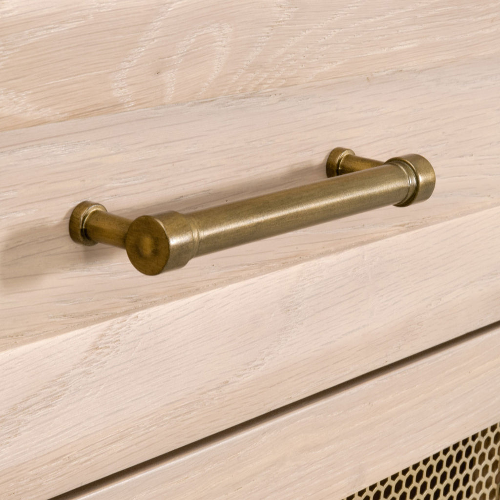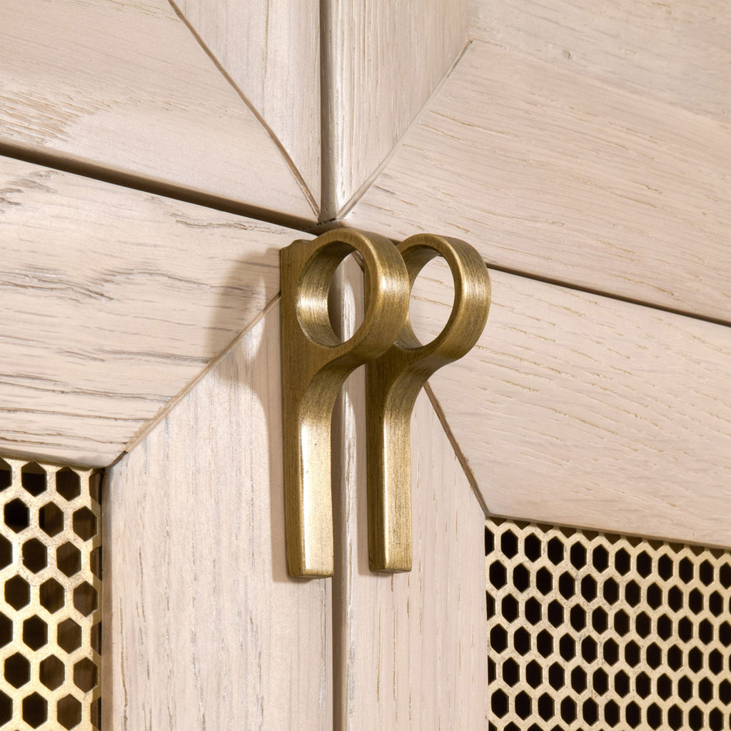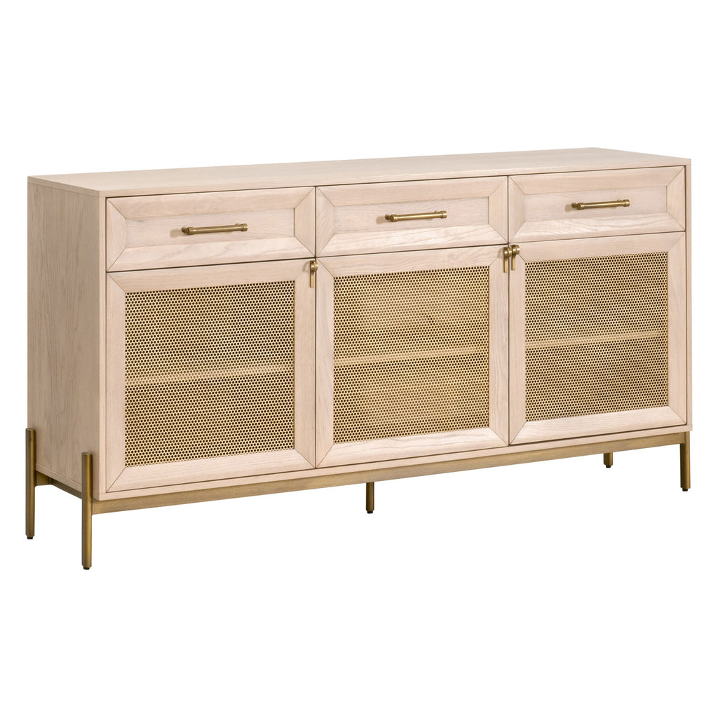 The multi-purpose Essentials for Living Dwell media sideboard was designed with versatility in mind. It can be used in the living room, dining room, entryway, or any room where extra storage space is desired. Whether you are using it for media, dishes, books, games, or other items, this sideboard has ample storage space. It's built with three storage drawers and two storage cabinets with adjustable and removable shelves. The backside contains two cord management holes for electronic devices. The doors feature see-through brushed gold metal mesh framed by a beautiful light honey oak wood and matching brushed gold handles. You can complete your living space and store away household necessities with this transitional wood sideboard.