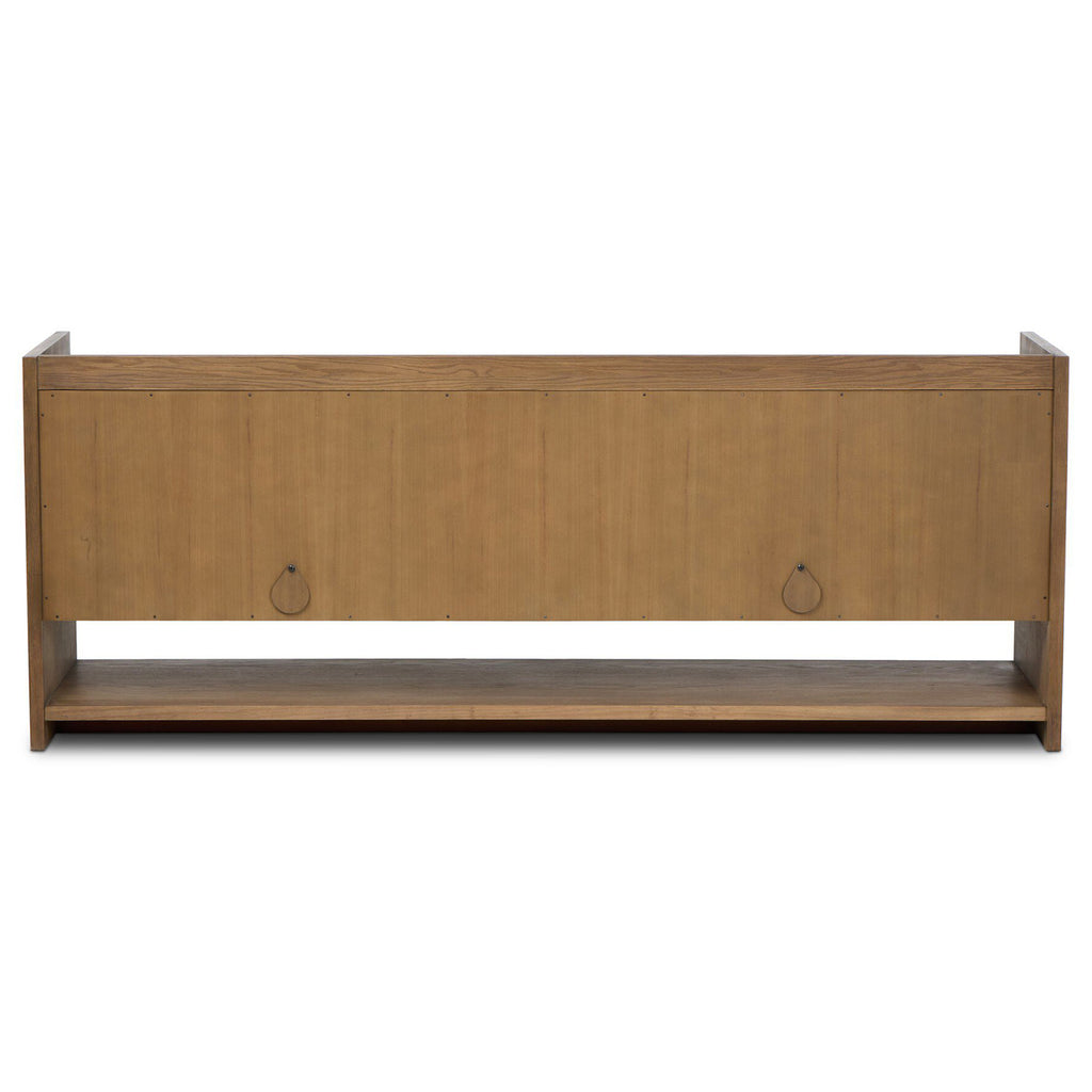 Resawn warm oak gives this sideboard's simple paneled design its standout striations. The paneled frame has a gallery top, and the bottom shelf provides open storage.
