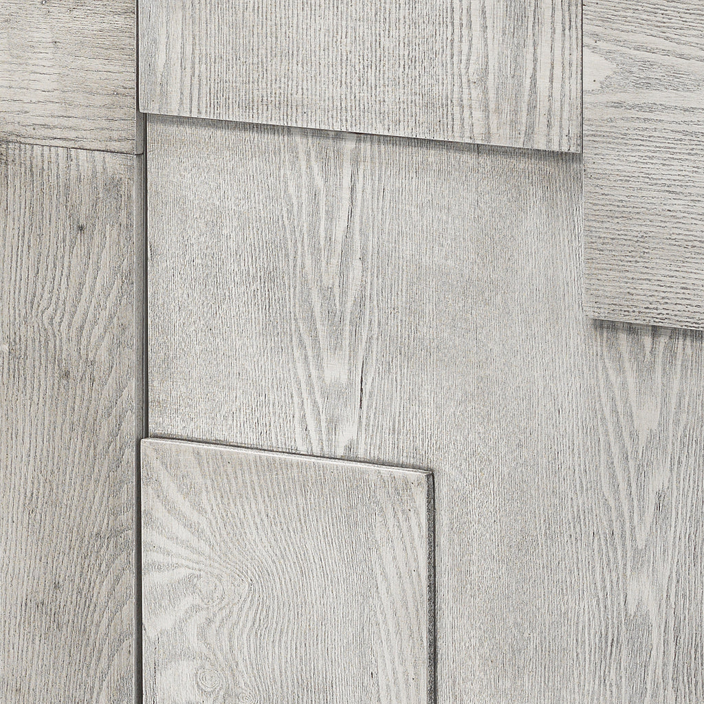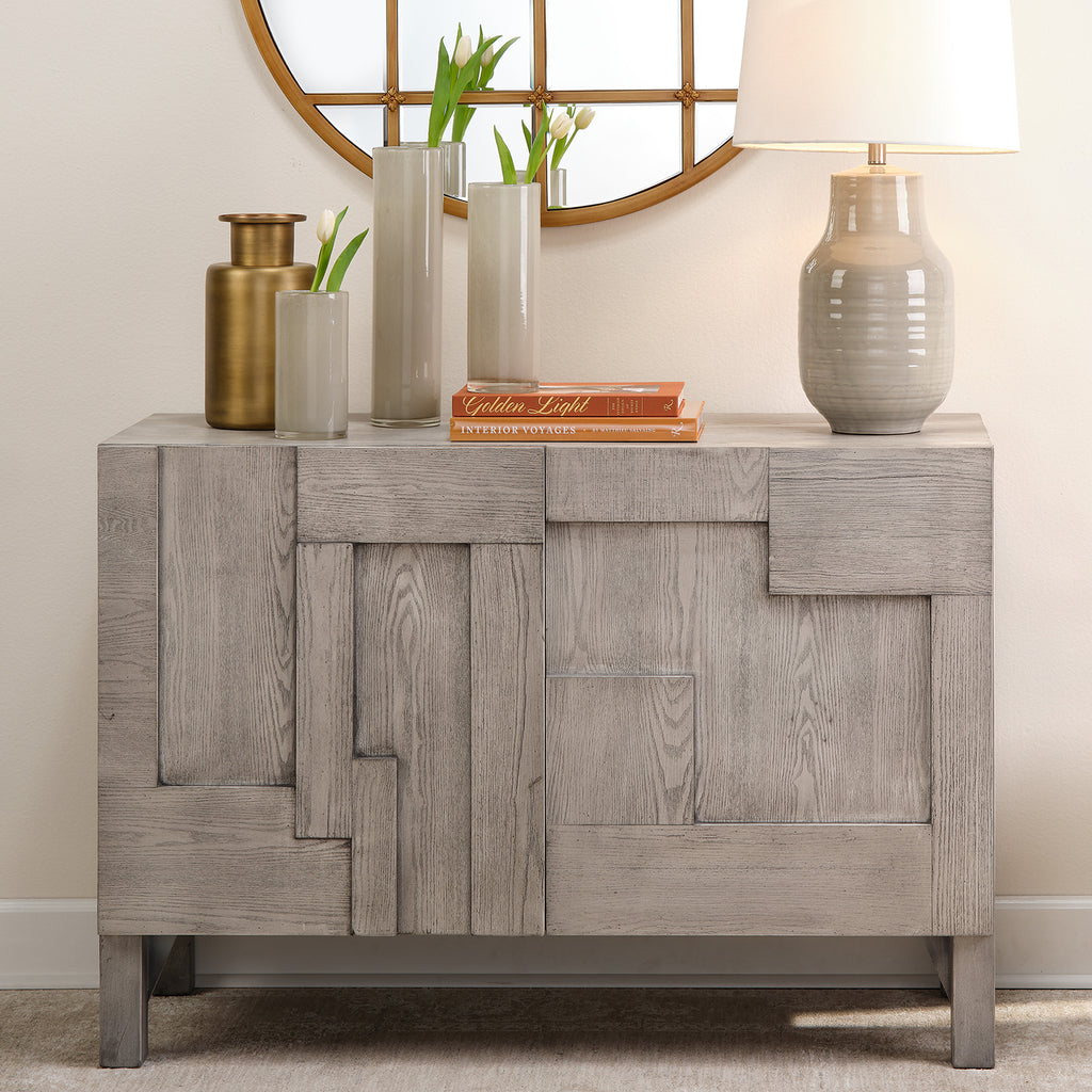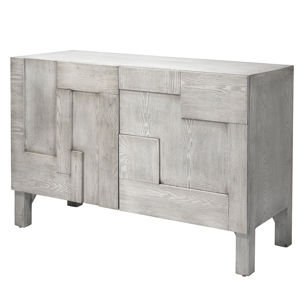 The intriguing geometric shapes integrated into the exteriors of this credenza lend it a rustic yet modern look. The grey washed finish and panels showcase the individual grain of the wood, making this an eye-catching addition to any room.