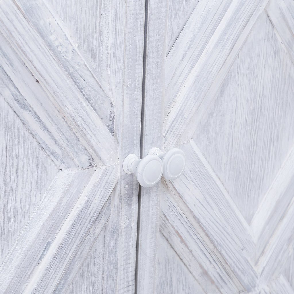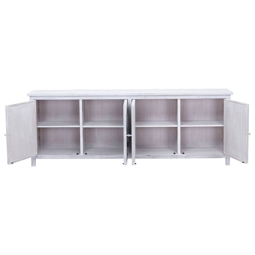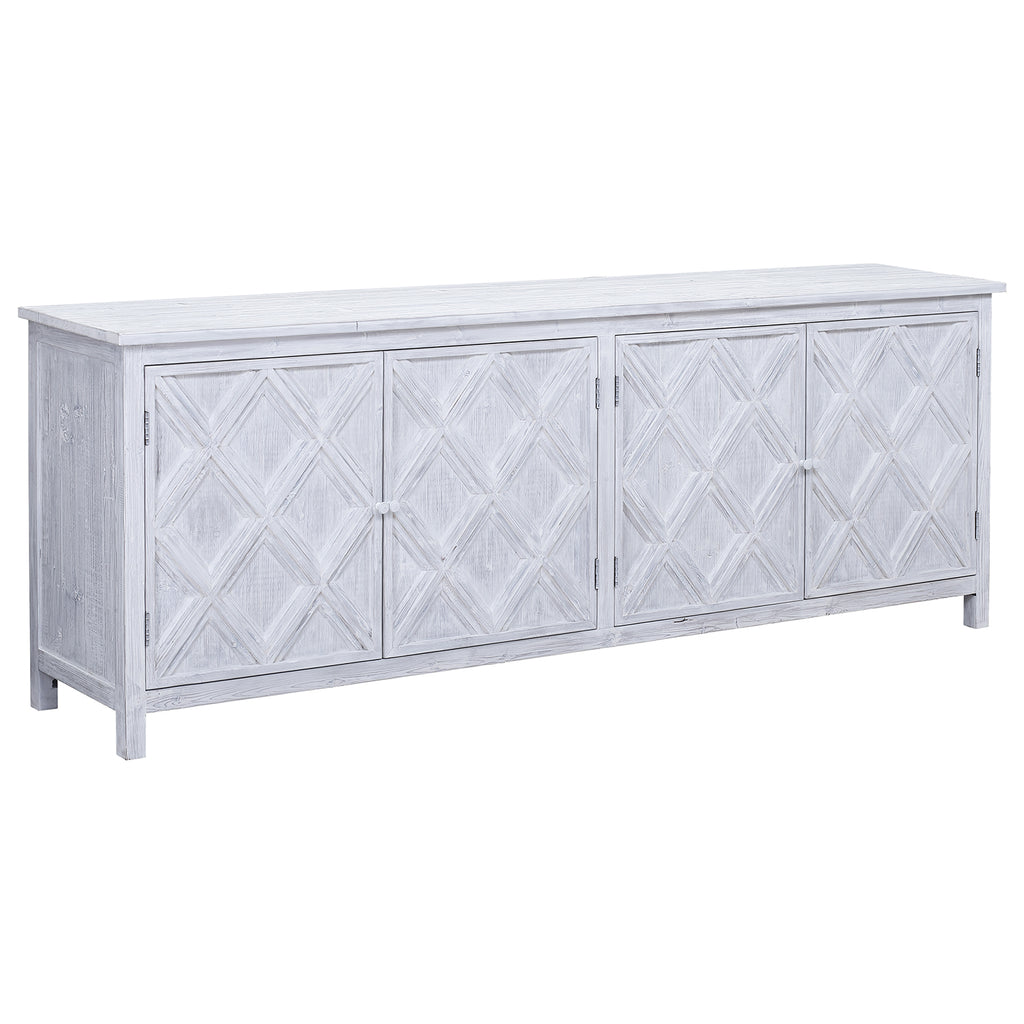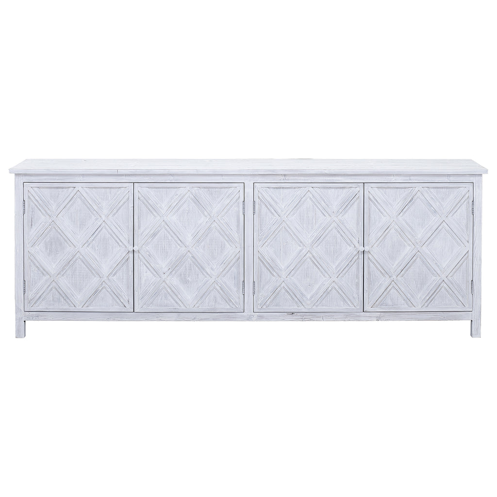This extra-long sideboard stretches out at 94" in length and made from solid reclaimed Pine hardwood. Finished with a beautiful, whitewashed finish and hand carved door fronts in an elegant and fun crisscross pattern with understated door pulls that open to large storage compartments. Inside are built-in shelves with magnetic closures for a secure close. This piece will add a fun flare to any home.