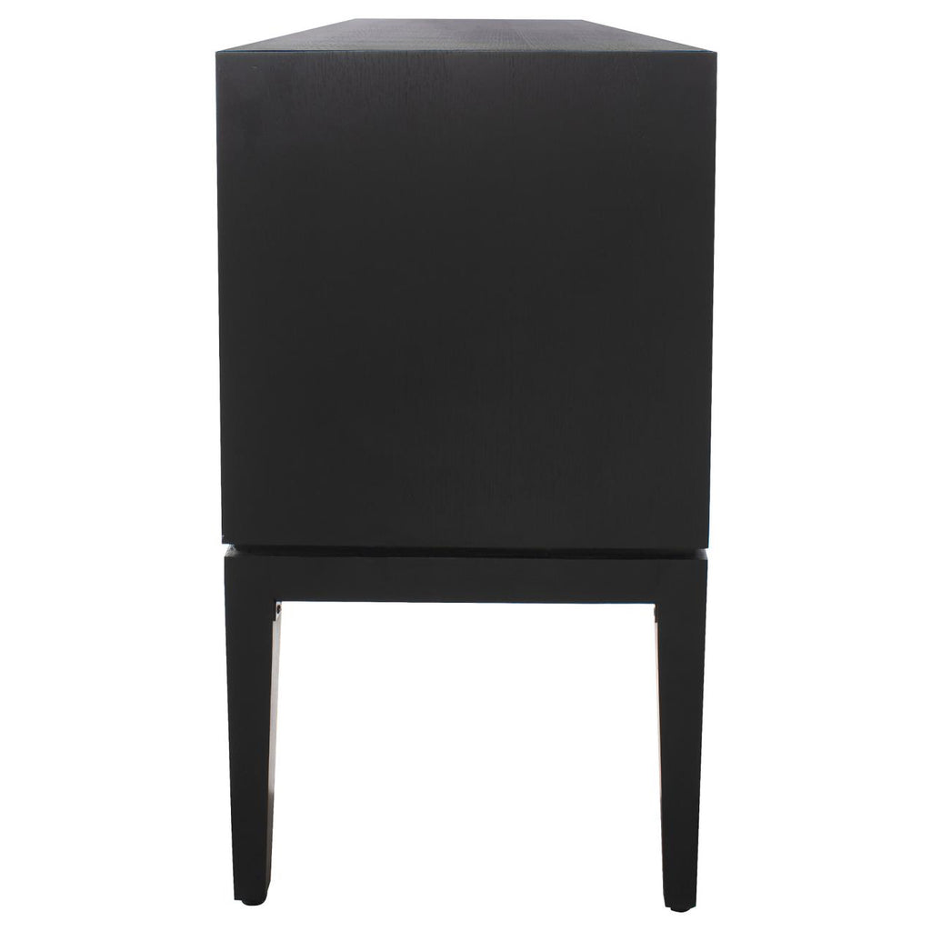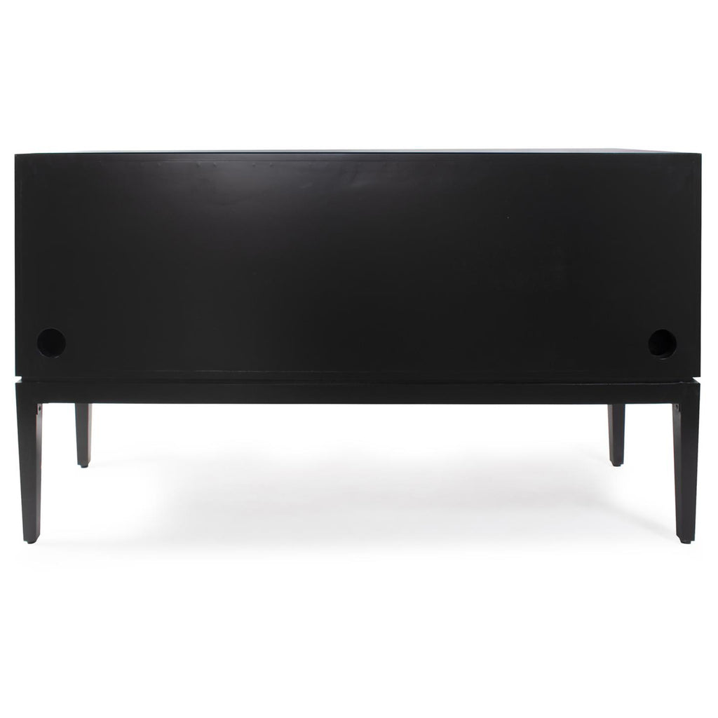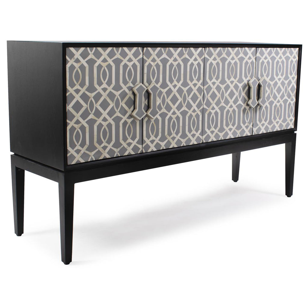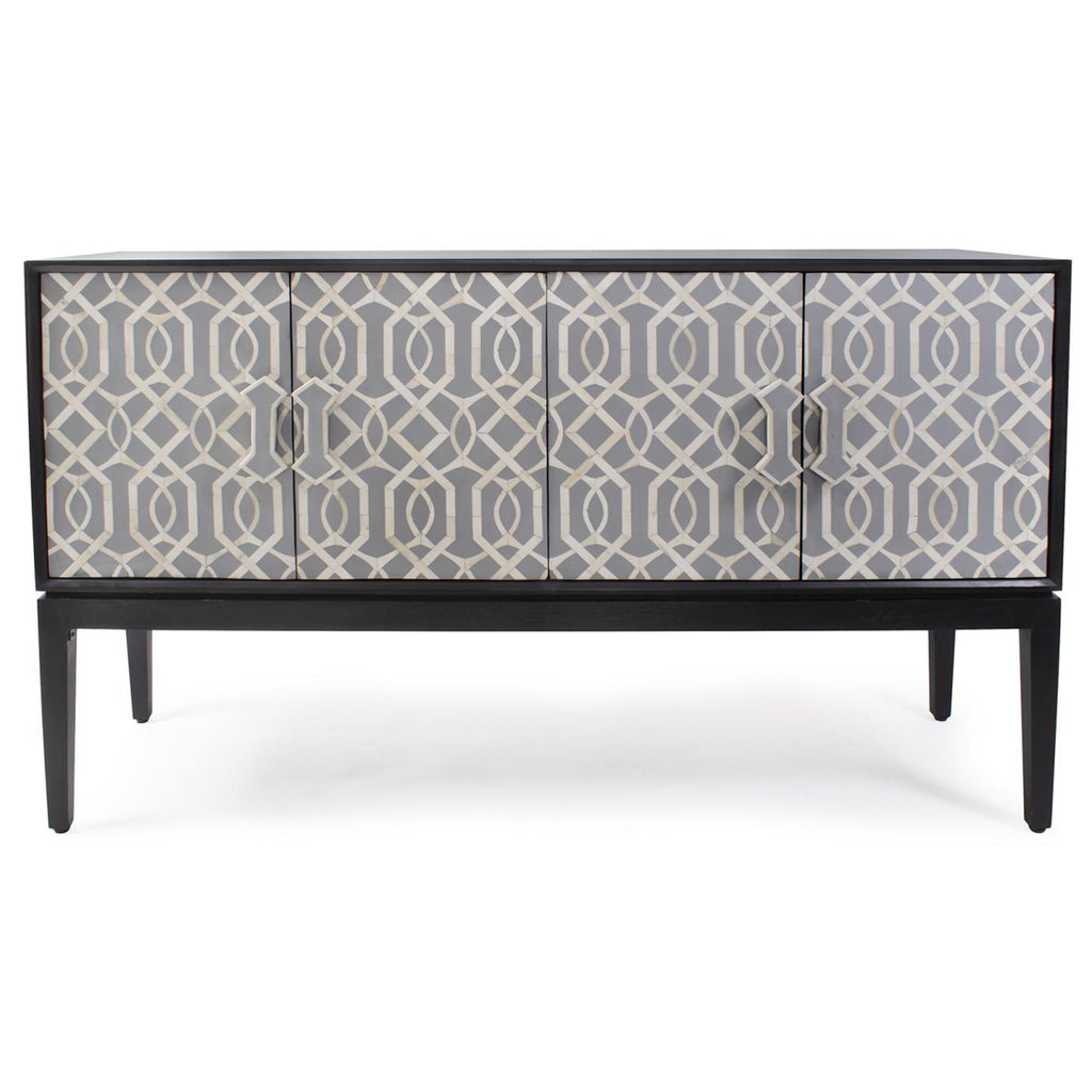 Elevate your home bar or dining area! This striking piece features a deep black exterior that exudes a sense of modern sophistication. Its front is adorned with meticulous hand applied bone inlay, showcasing an intricate lattice pattern in soothing grey and bone hues. This unique credenza wine rack boasts a shelf for displaying your favorite bottles, and multiple wine slots to keep your collection organized. Additionally, it features wine glass sections designed to securely hold your stemware, making it convenient to pour a glass of your favorite vintage. This credenza wine rack not only provides practical storage but also serves as an artful centerpiece, infusing your space with a sense of luxury and refined craftsmanship that's perfect for both entertaining and everyday enjoyment.