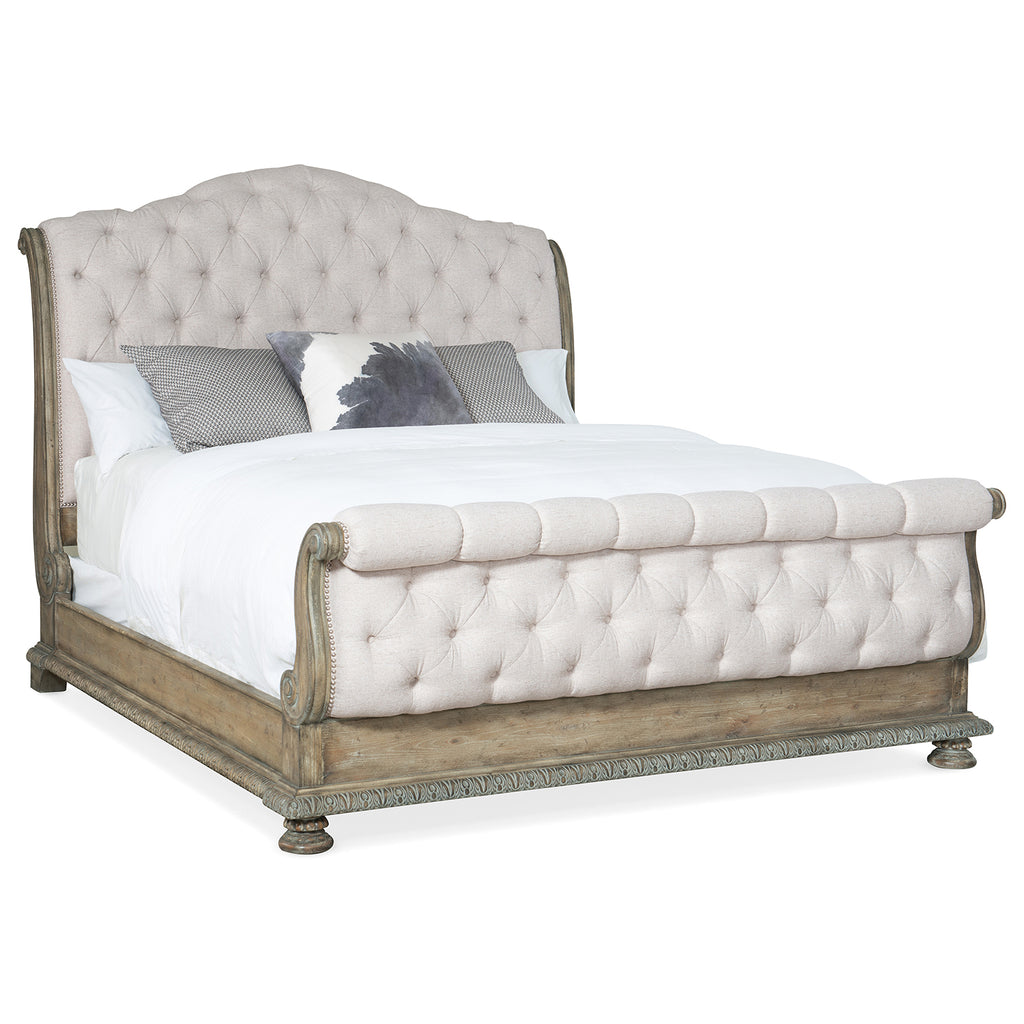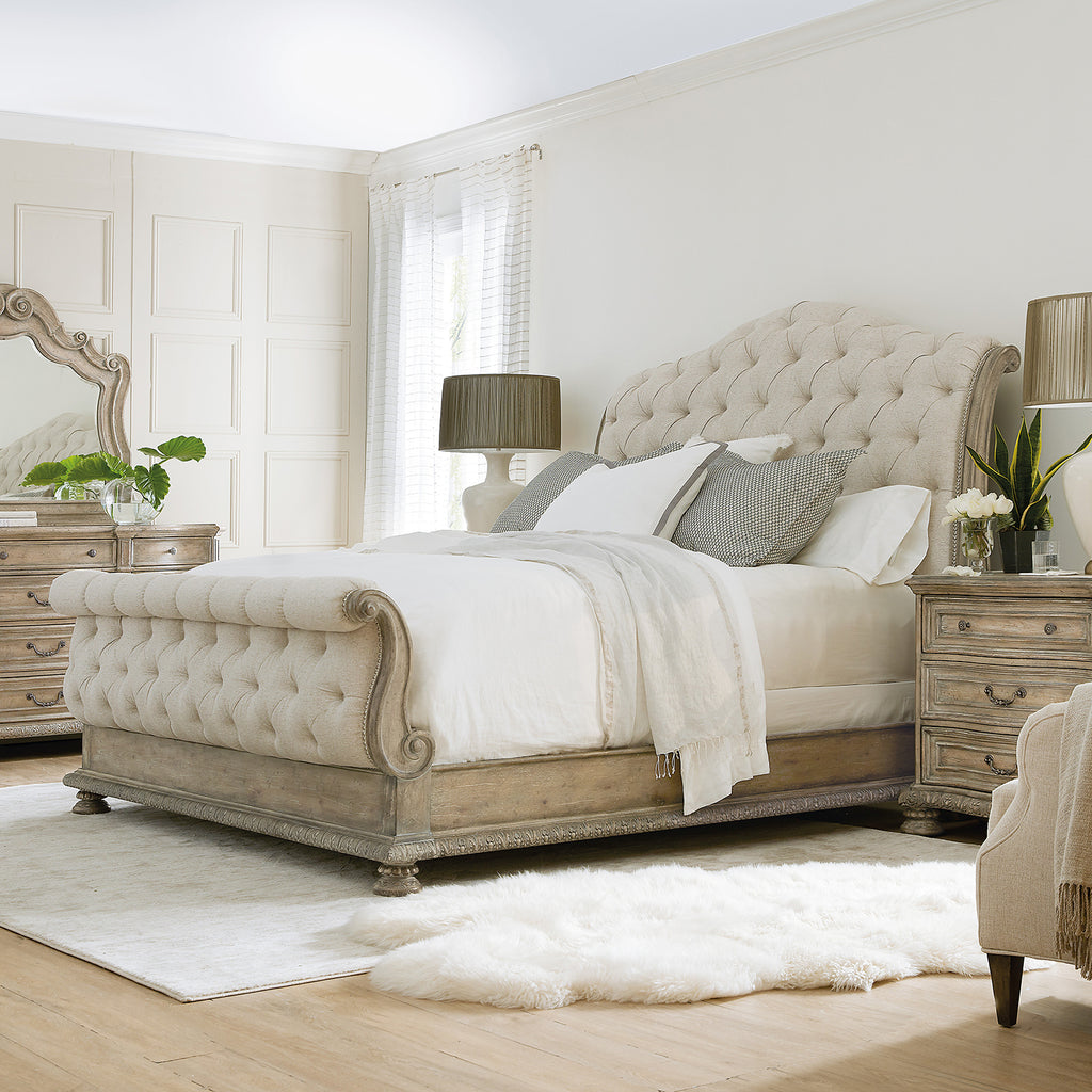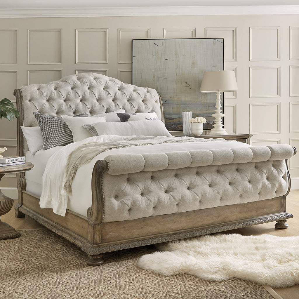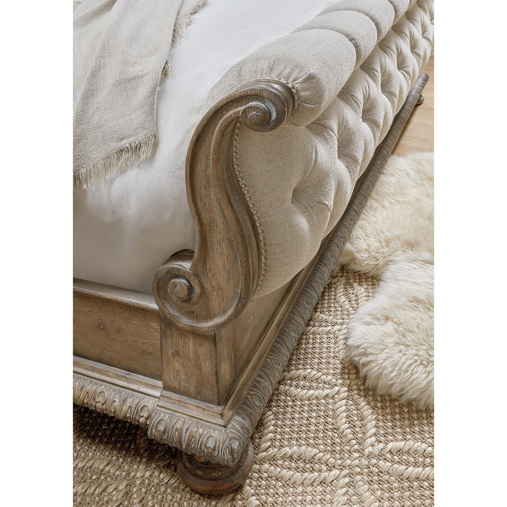 Grand scale and soft, sweeping lines infuse the statement Castella Tufted Bed with emotion. Upholstered in a beautifully woven multi-dimensional texture fabric in a creamy Natural Tan performance fabric with repeated tufting for a plush appearance, the bed is easily mixed with any color scheme. Acanthus leaf carving detail around the base of the bed adds the final touch of classic appeal to this over-the-top bed. Includes Headboard, Footboard and Rails.