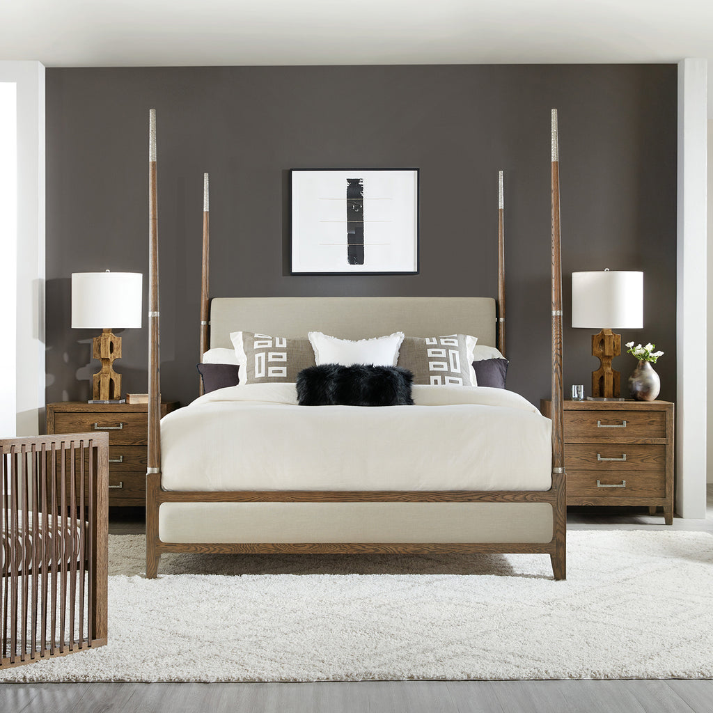 Inspired by downtown urban living, the stunning Chapman Four Poster Bed has a headboard and footboard upholstered in Samantha Taupe and dramatic, slender posts accented by hand-hammered metal in a pewter finish. The footboard and bed are framed in White Oak Veneers in the warm brown Sorrel finish that reveals the beauty of the woodgrain. Includes Headboard, Footboard and Rails. Headboard can be used alone.