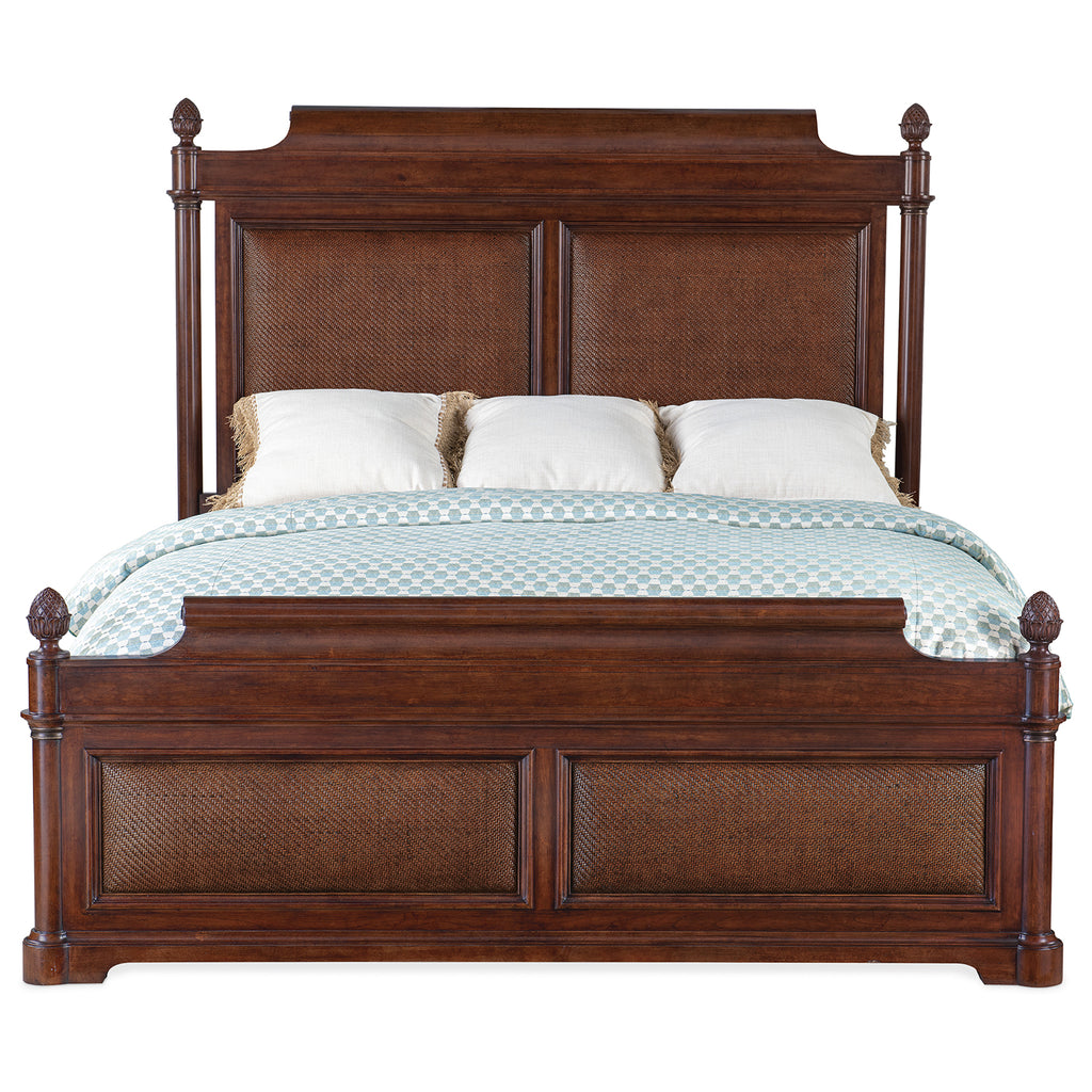 The tropical craftsmanship and botanical carving of the West Indies meets southern hospitality and grace with this stunning Charleston California King Panel Bed. Crafted of Cherry and Walnut Veneers with Walnut Inlay and Cane, the bed has raffia panels on the headboard and footboard, and pineapple finials on the low posts. The bed is finished in Maraschino Cherry using natural grain Cherry Veneers with dramatic cathedral structure and naturally-occurring knots to deliver a rich warm cherry finish and a smooth sophisticated aesthetic. Headboard can be used alone.