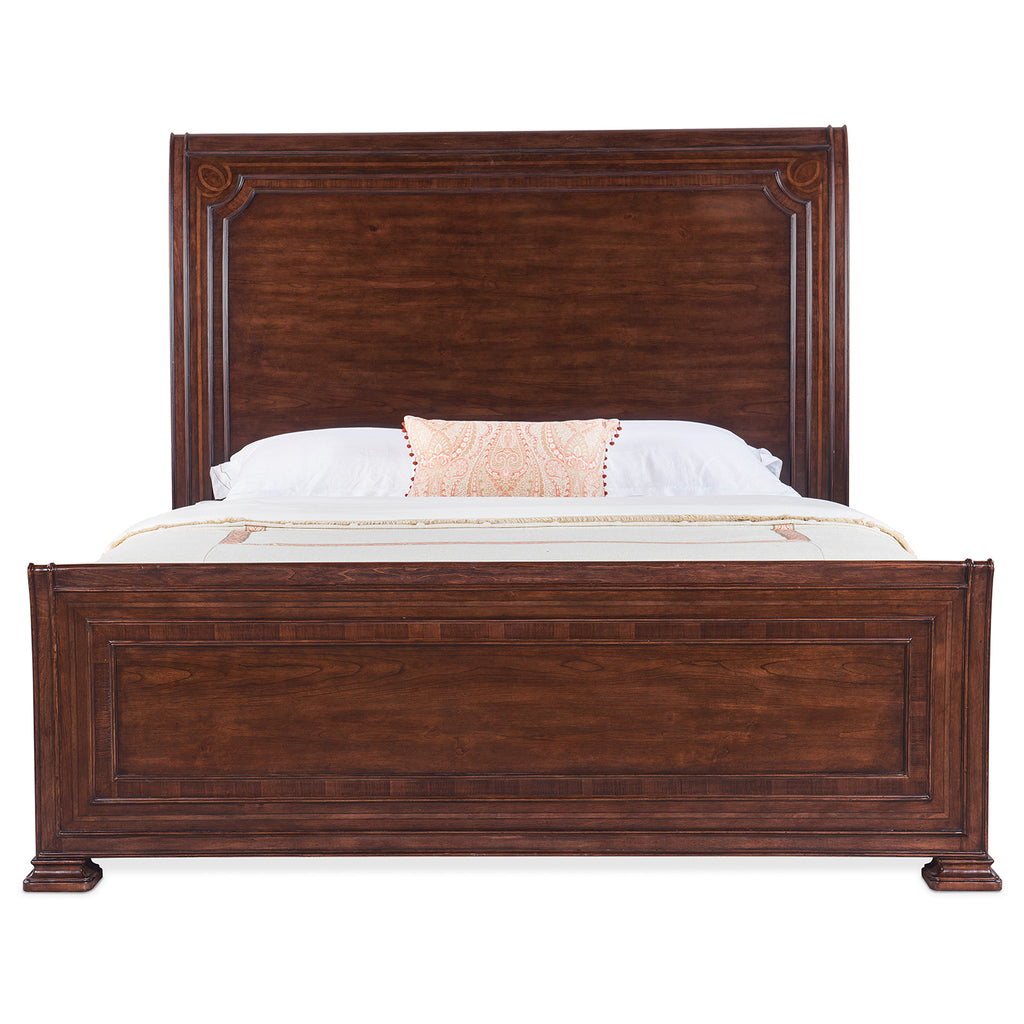 With the grandeur of a mansion bed in an updated silhouette, the Charleston Sleigh Bed is crafted of Cherry and Walnut Veneers with Maple and decorative Walnut inlay accents. Raised panels on the wood headboard and footboard and stepped block feet add designer appeal. The bed is finished in Maraschino Cherry using natural grain Cherry Veneers showcasing a dramatic cathedral structure with naturally occurring knots to deliver a rich warm finish and a smooth sophisticated aesthetic.