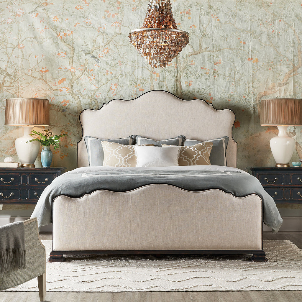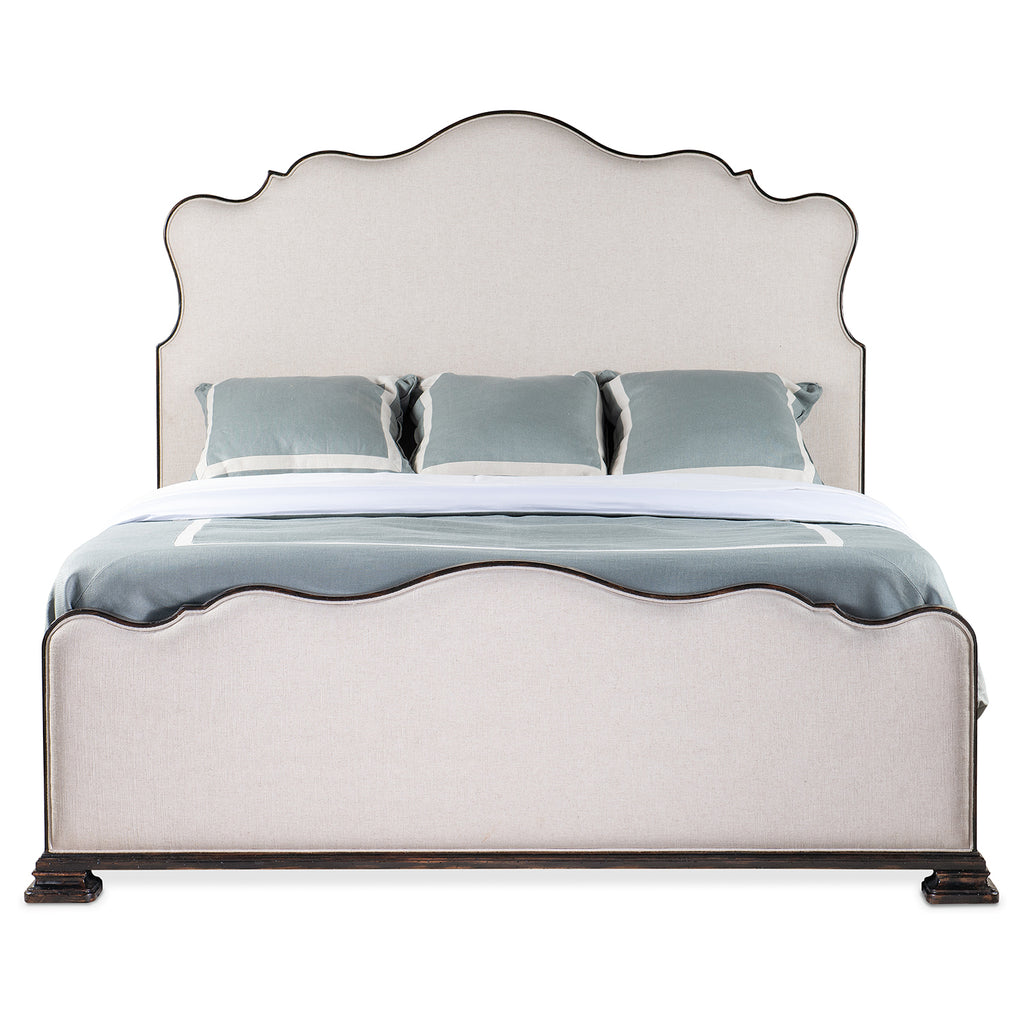 The stunning Charleston King Upholstered Bed marries a traditional soul with a hint of cosmopolitan chic. Contrasting the rich Black Cherry heirloom finish on the wood trim, side panels and feet with the Chateau Linen upholstery on the scalloped-edge headboard and footboard, the bed is crafted of Cherry Veneers and fabric.