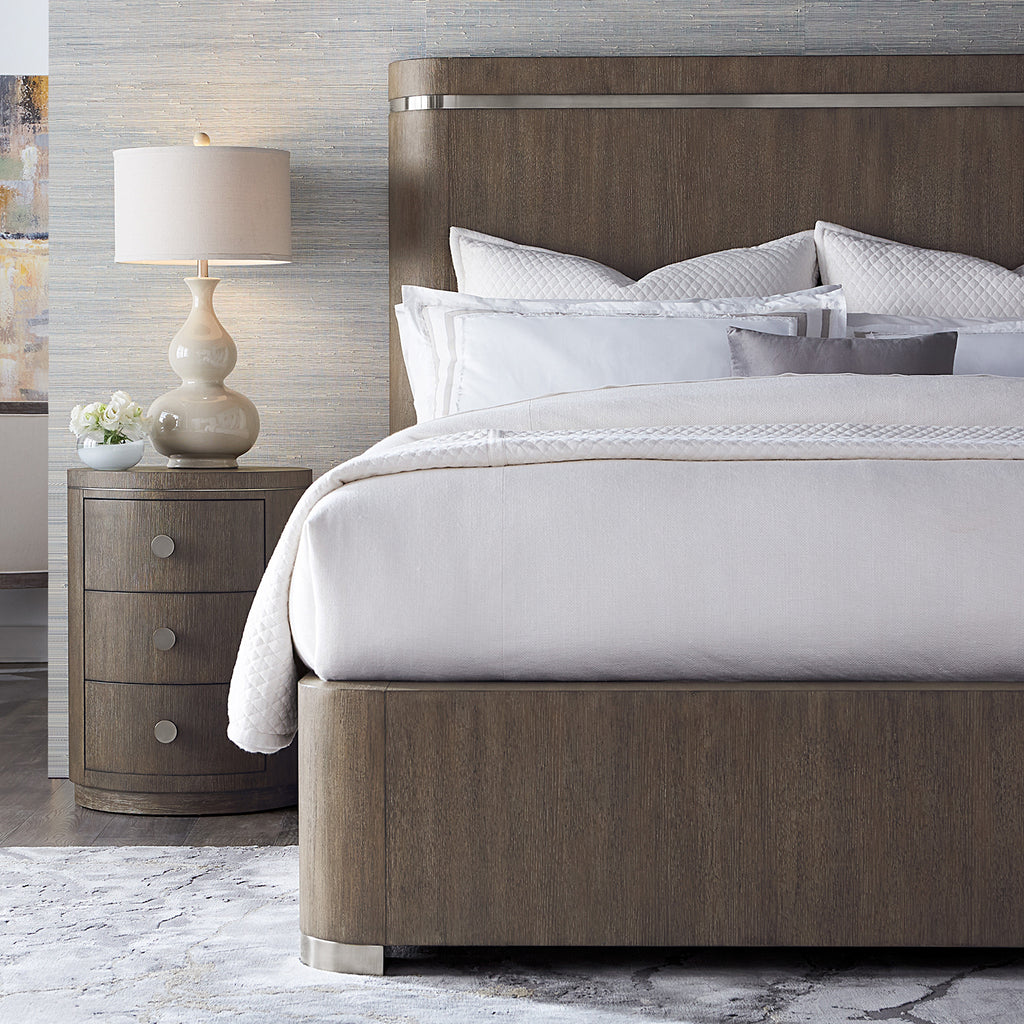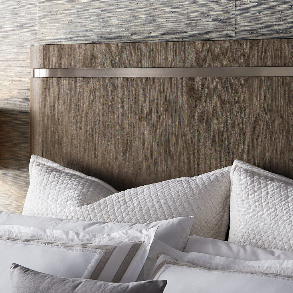 With an unmistakably modern aesthetic that transcends time, the stunning Modern Mood Panel Bed has warm pewter-finished metal inlay trim in the headboard and metal-wrapped feet on the footboard, contrasting with the wire-brushed finish on the Oak Veneer frame.