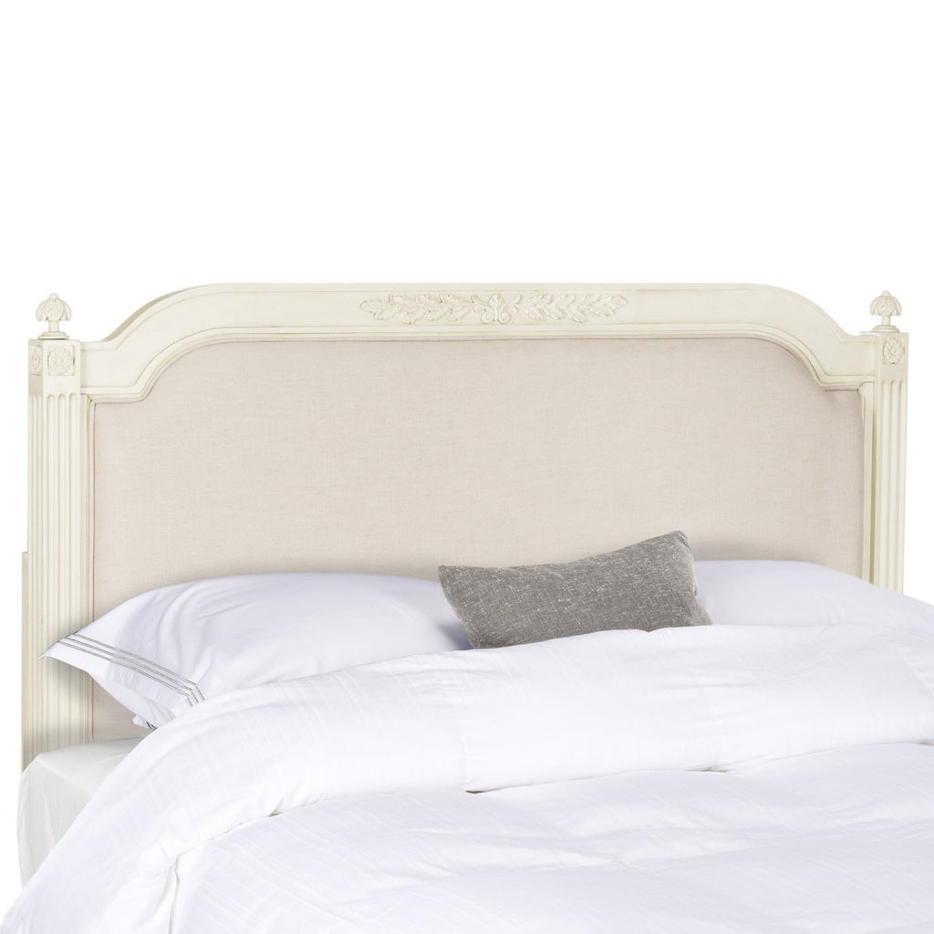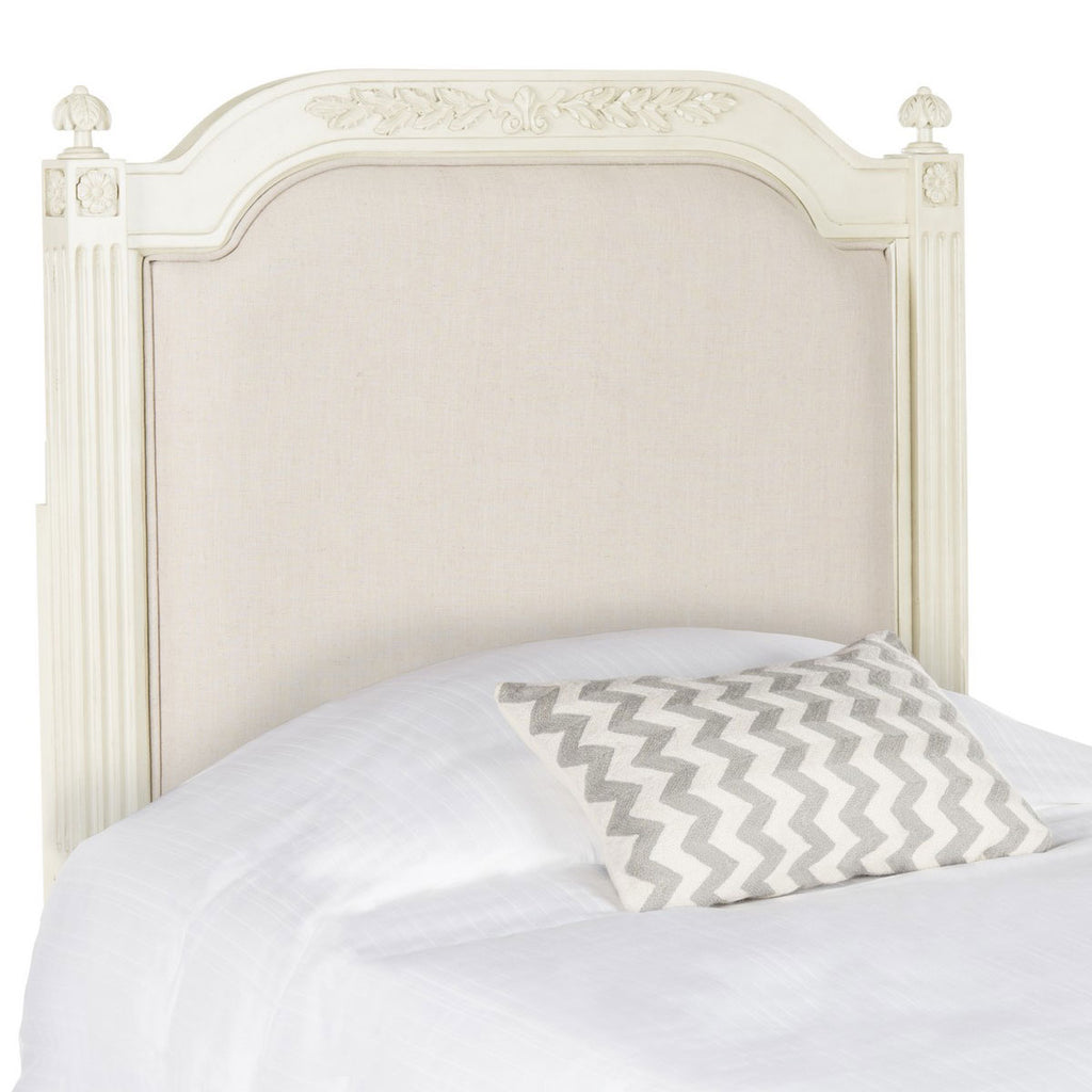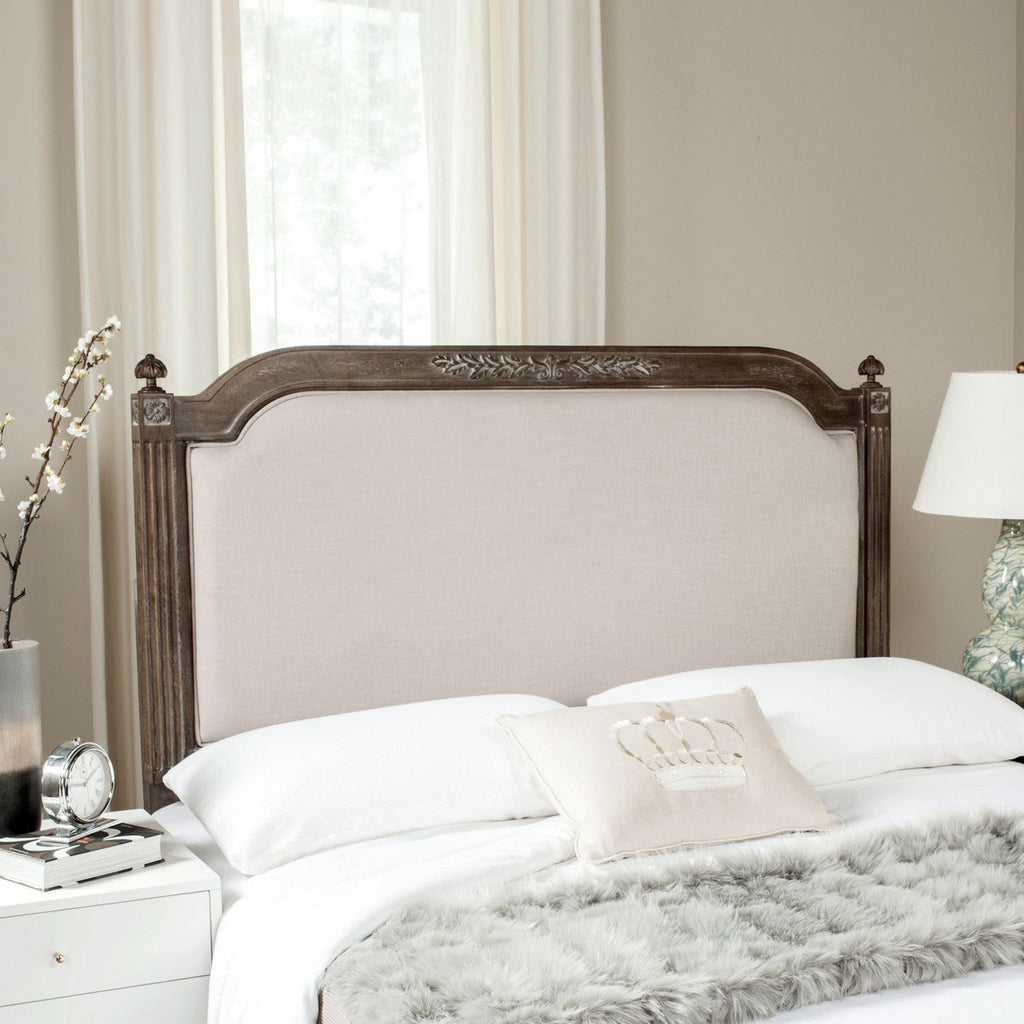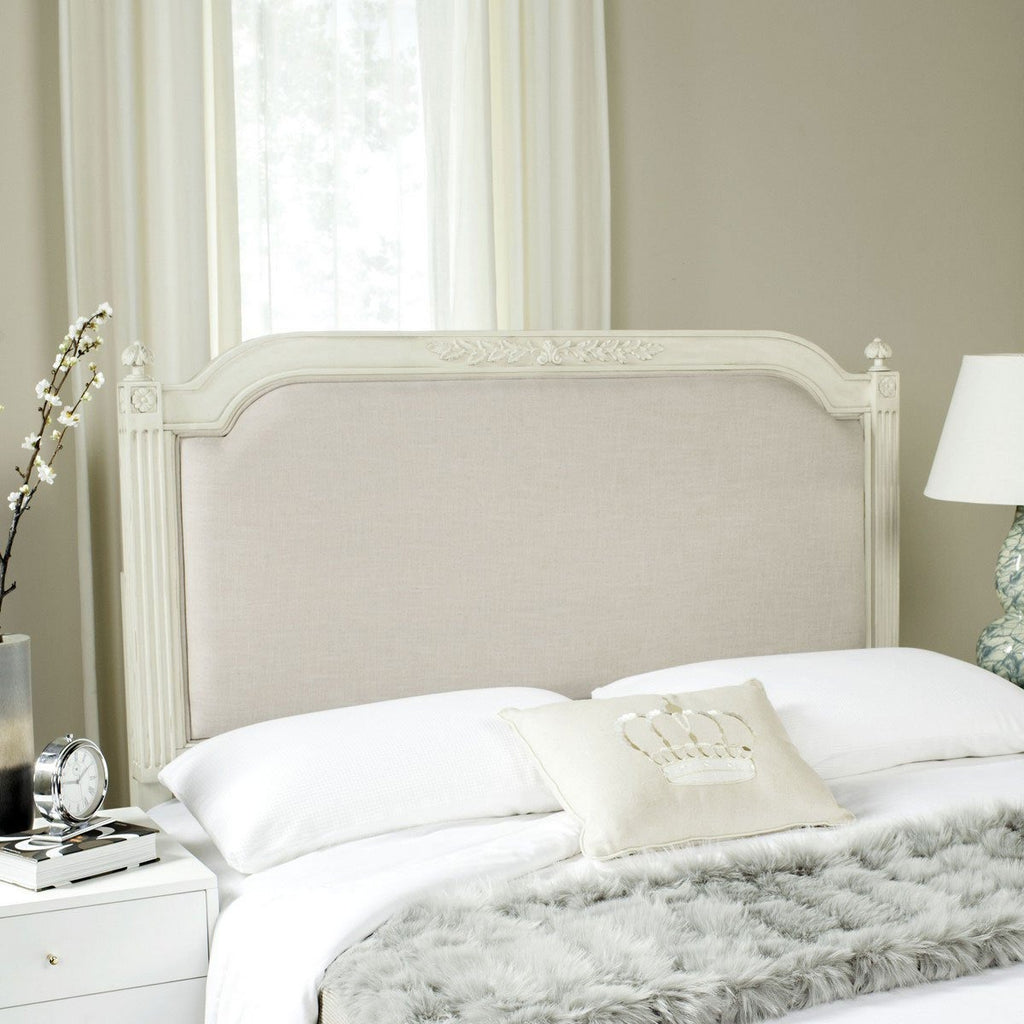 The luxuriant furnishings in the boudoir of a famous French actress inspired this headboard. Finished in a fine antique beige, it’s crafted using rustic oak wood to highlight its graceful linen upholstery. Delicate details create its heirloom style.