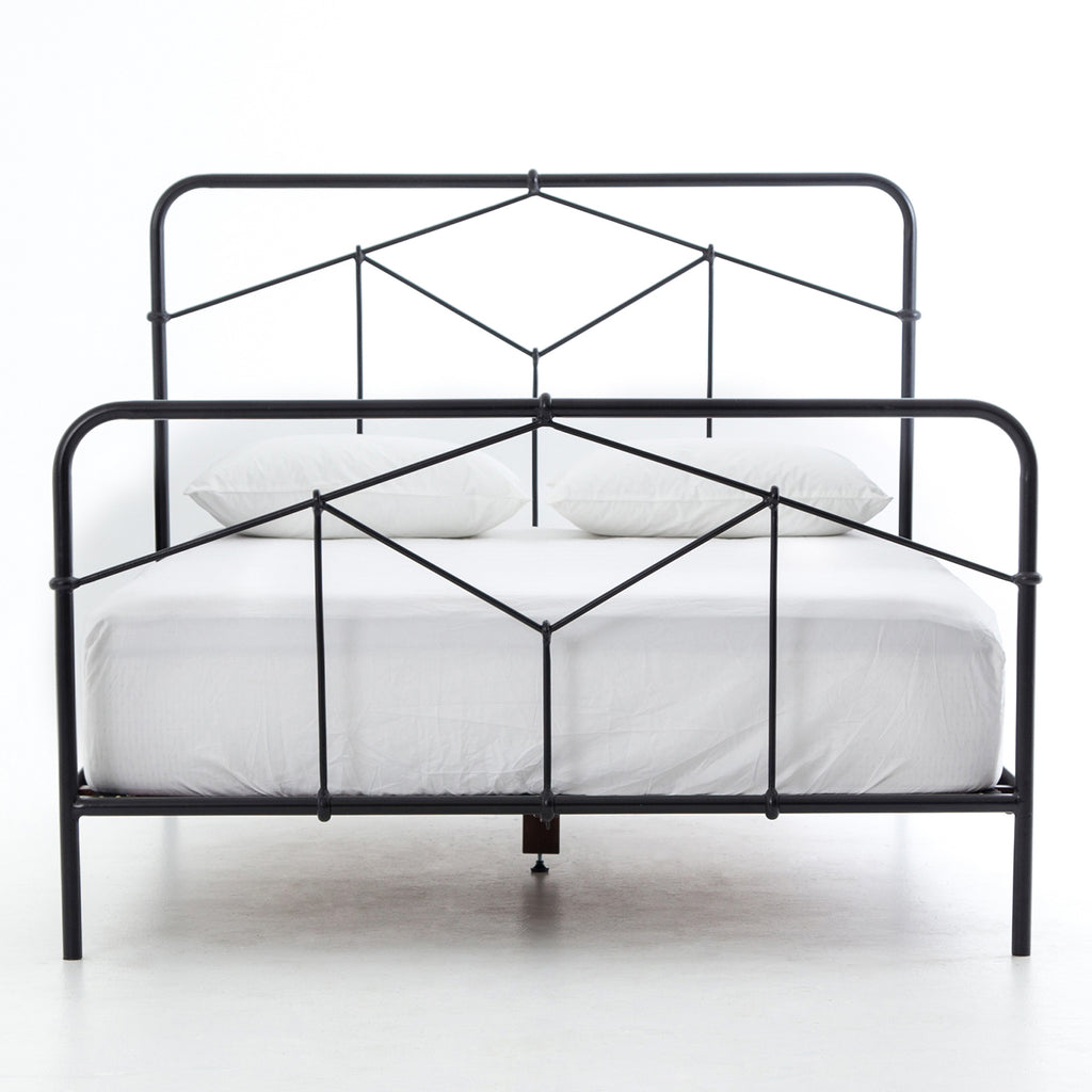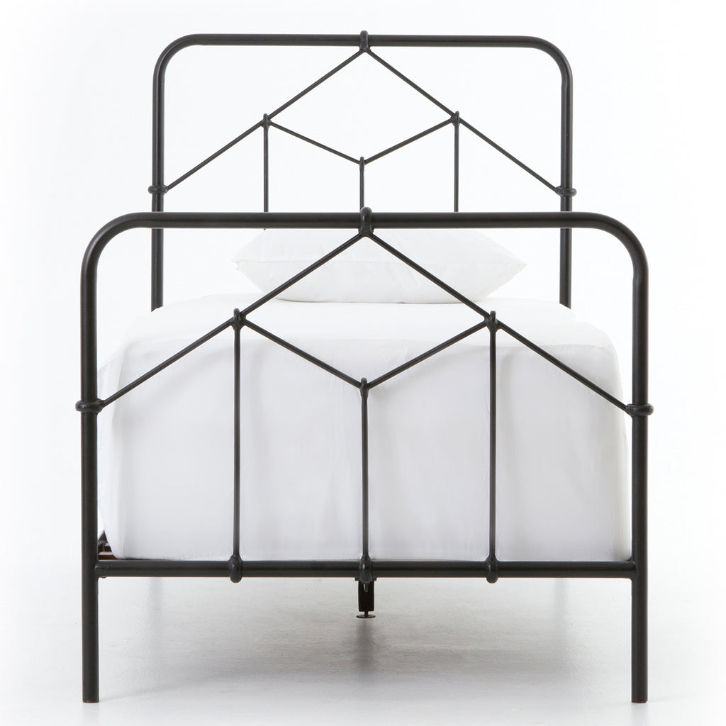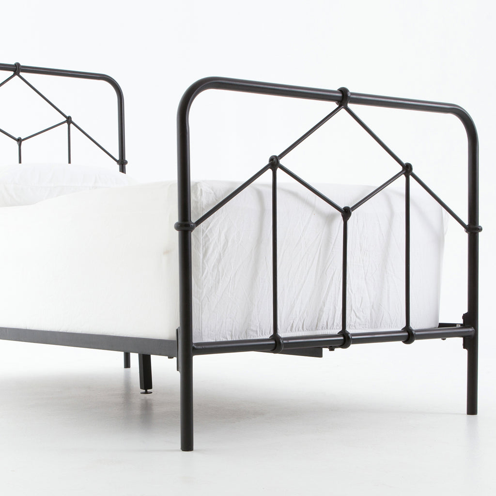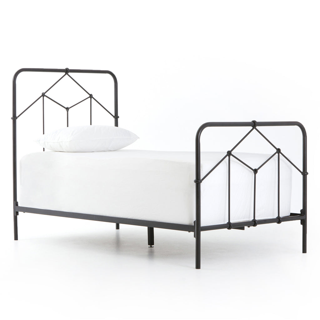Resolutely modern, Four Hands furniture collection mixes materials and influences for a fresh, inspired look. Modern geometric patterns update a design inspired by vintage European hospital beds. Simple iron tubing looks airy and feels substantial. Twin size stunning when paired. Low-profile box spring recommended.