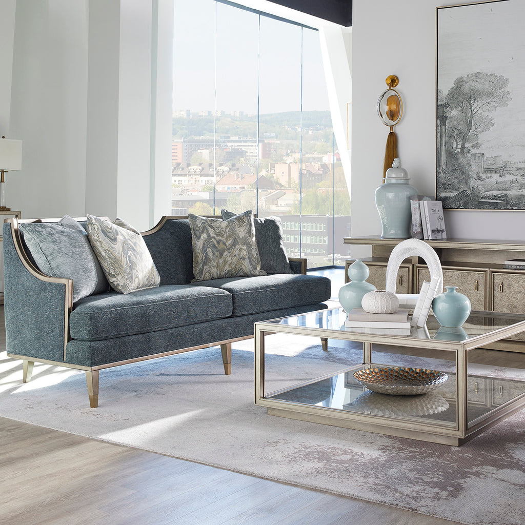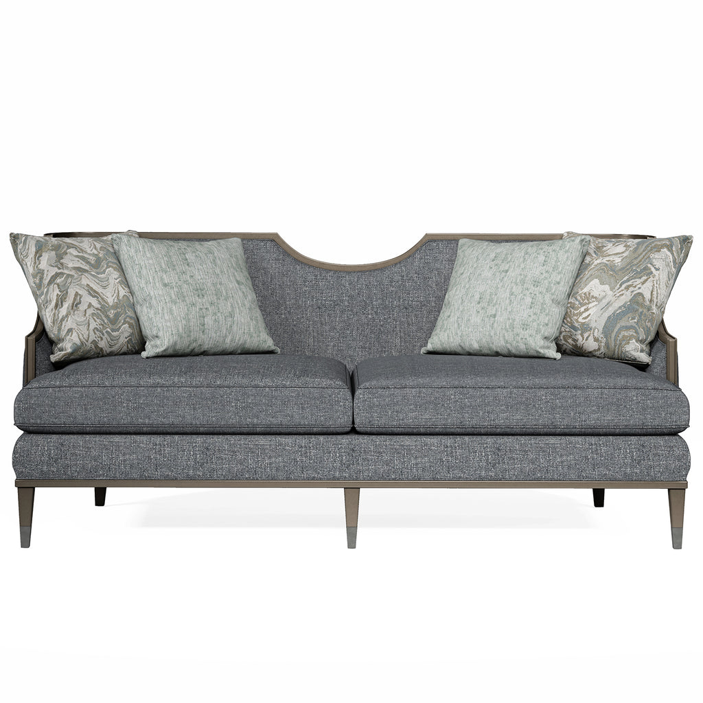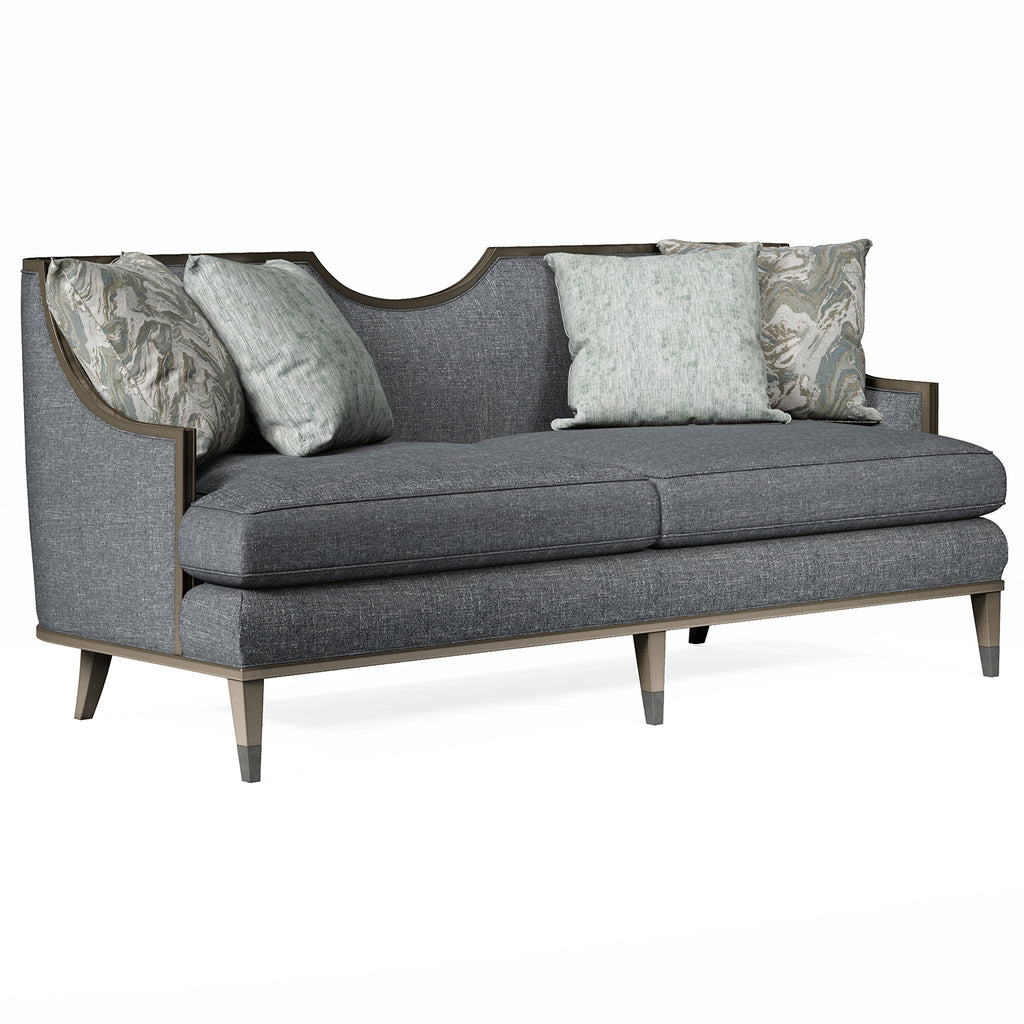 Clean and classic, the sleek Harper Sofa brings together elements of both contemporary and traditional design: square tapered wood legs, exposed wood frame, curved arms, and a reverse half moon cut out on the back. The sofas comfort, however, is 100 percent modern: tailored upholstered back and deck and two down-blend seat cushions, plus two pairs of down blend throw pillows.