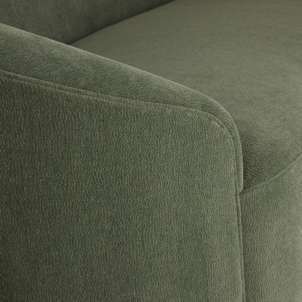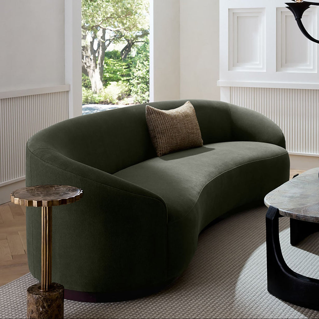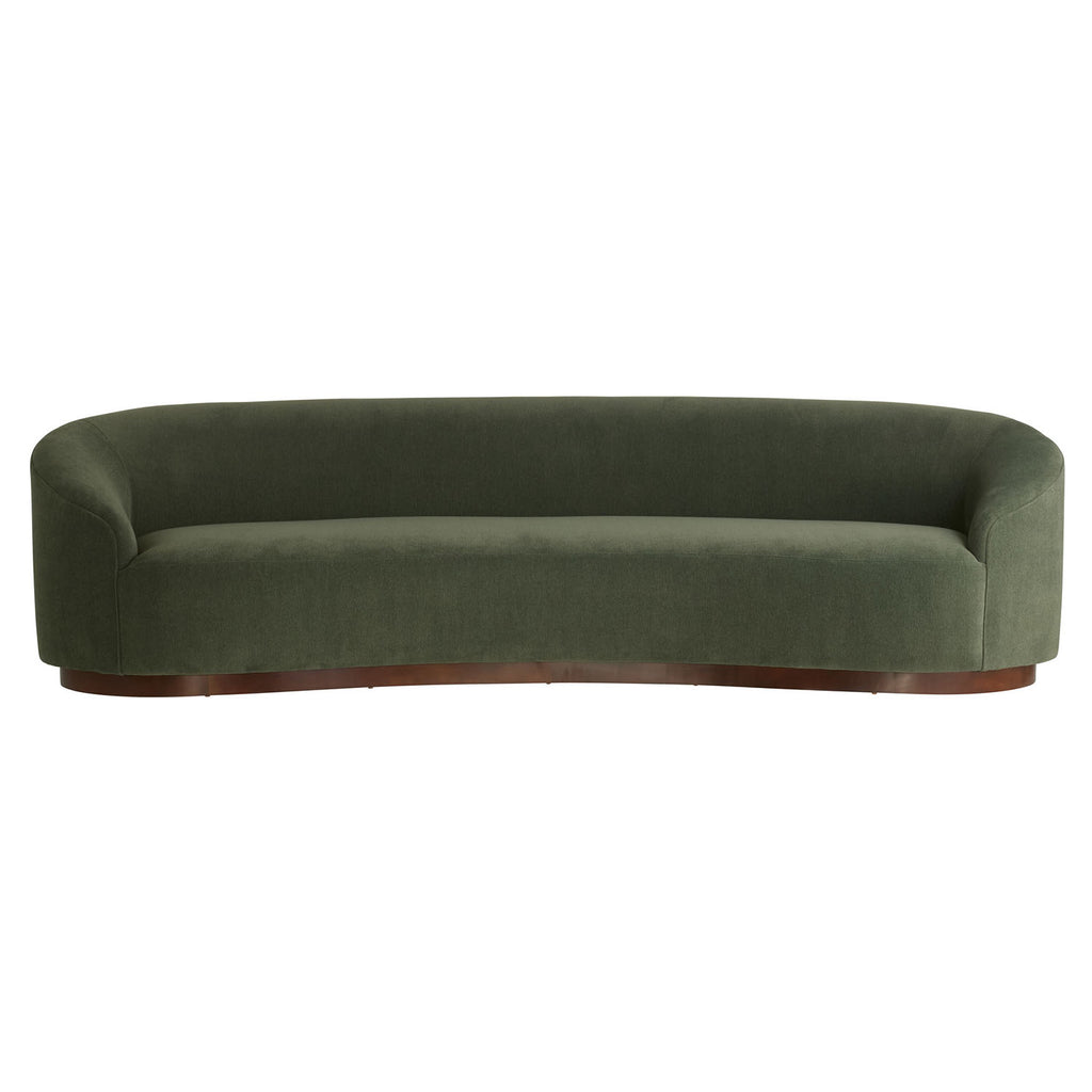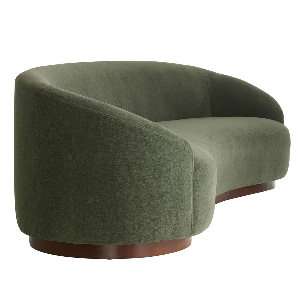 The graceful curvature of this sofa presents a sleek yet inviting form, making the Turner the perfect anchor for any room designed for entertaining. Perched on a plinth maple wood base in a dark walnut finish and upholstered in a pine performance chenille, it can be floated with two facing each other, creating an environment for conversation, or used alongside our elegant occasional tables.