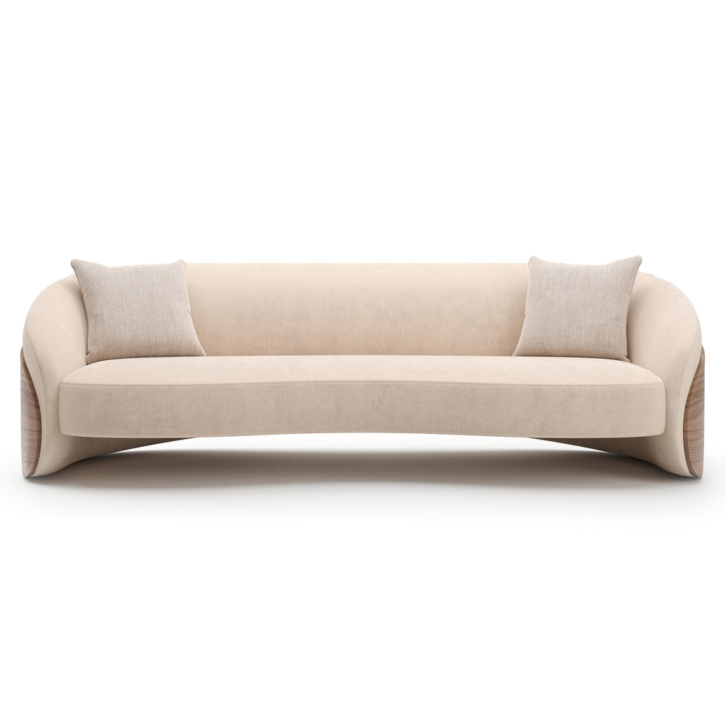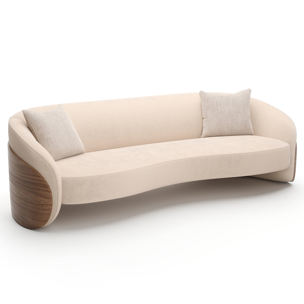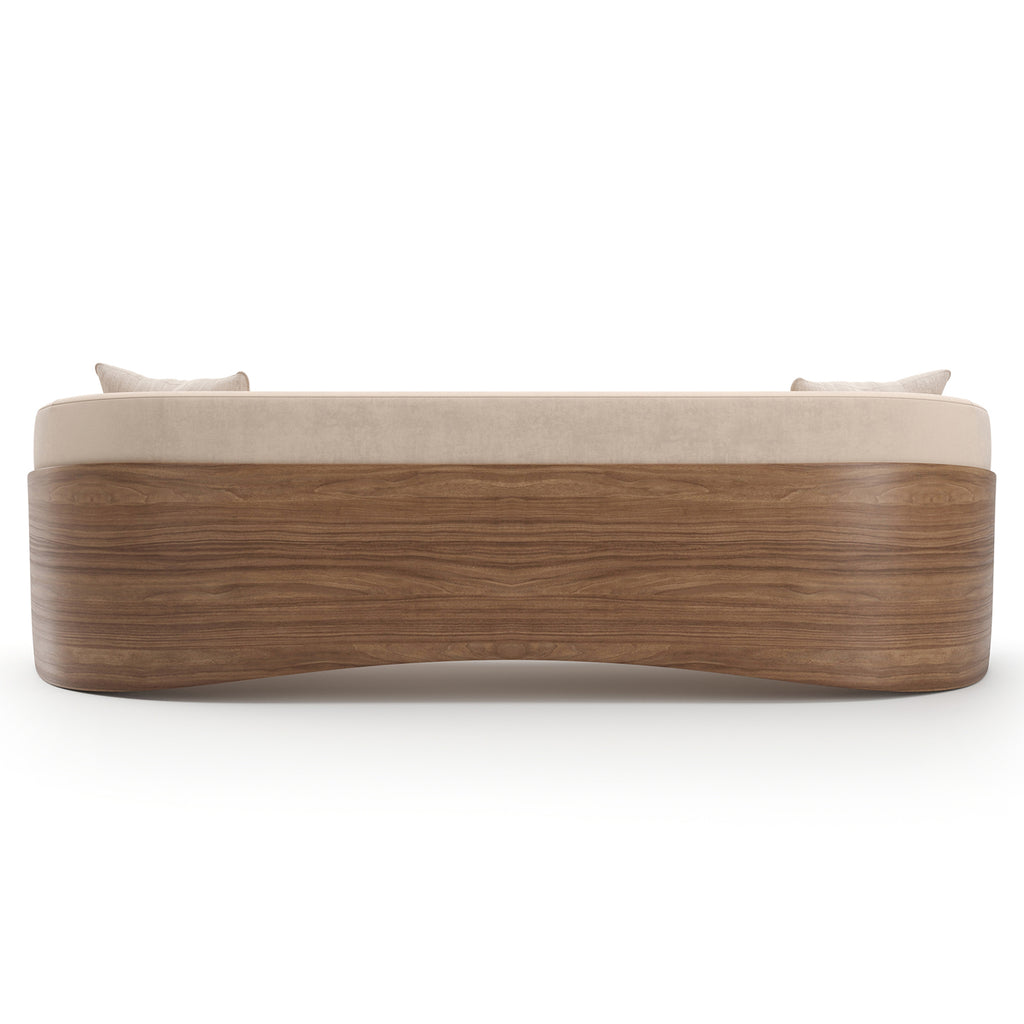 Indulge in luxurious repose with the Fleur Wood Back Sofa. Beautifully upholstered in ivory faux mohair and framed with the subtle sophistication of Porcini finish, it gracefully anchors any room with elegance.