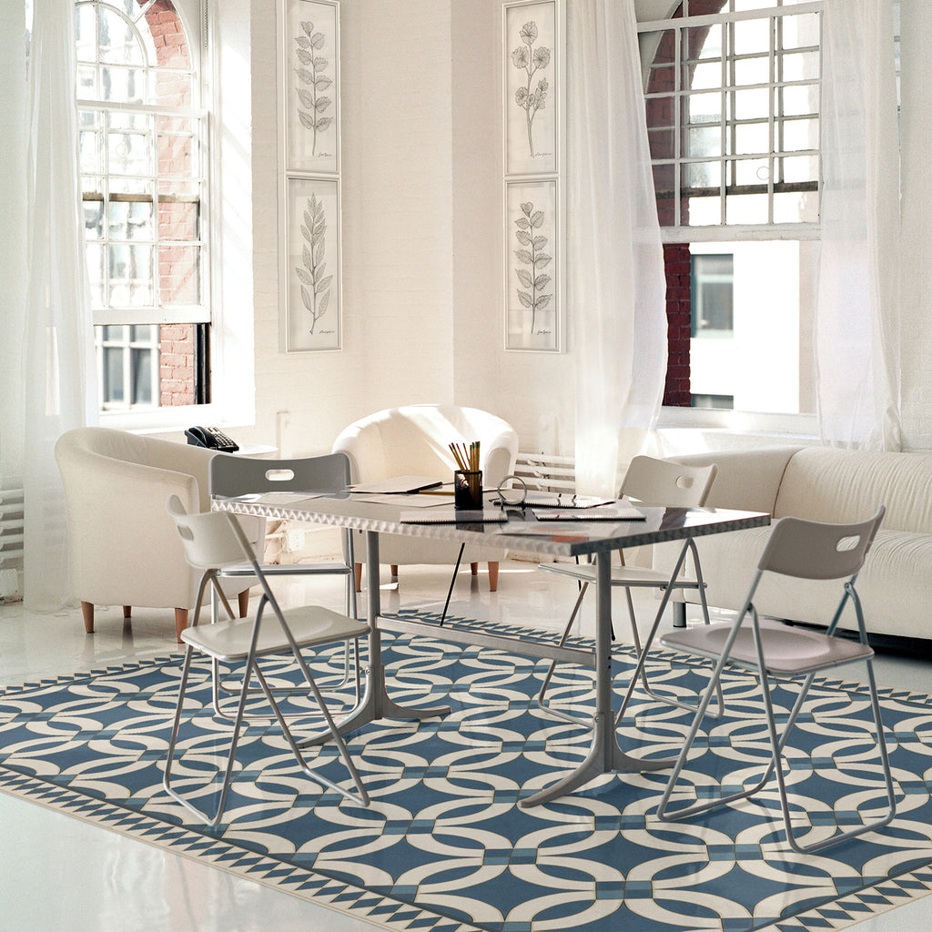 The Philippa vinyl floor cloth from the Folk Art Museum Wedding Ring collection was inspired by vintage linoleum. Perfect for kitchens, baths, screened in porches and patios, the durable vinyl floorcloths are easy to clean and always lay flat. Vinyl floorcloths are made with two-ply vinyl with latex padded backing, designed to be fade-resistant in direct sunlight and durable against the elements but work best in controlled outdoor environments.