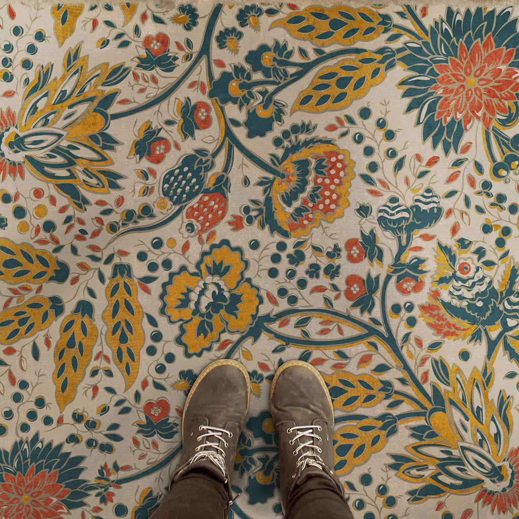 The The Owl & the Sparrow vinyl floor cloth from the Williamsburg Garden Gate collection was inspired by vintage linoleum. Perfect for kitchens, baths, screened in porches and patios, the durable vinyl floorcloths are easy to clean and always lay flat. Vinyl floorcloths are made with two-ply vinyl with latex padded backing, designed to be fade-resistant in direct sunlight and durable against the elements but work best in controlled outdoor environments.