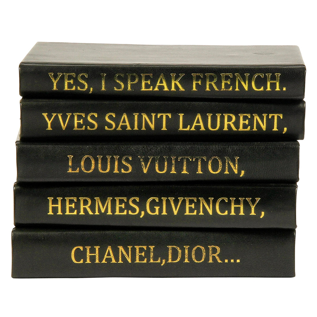 Stack of five books bound in black leather with I speak French quote in distressed gold lettering.