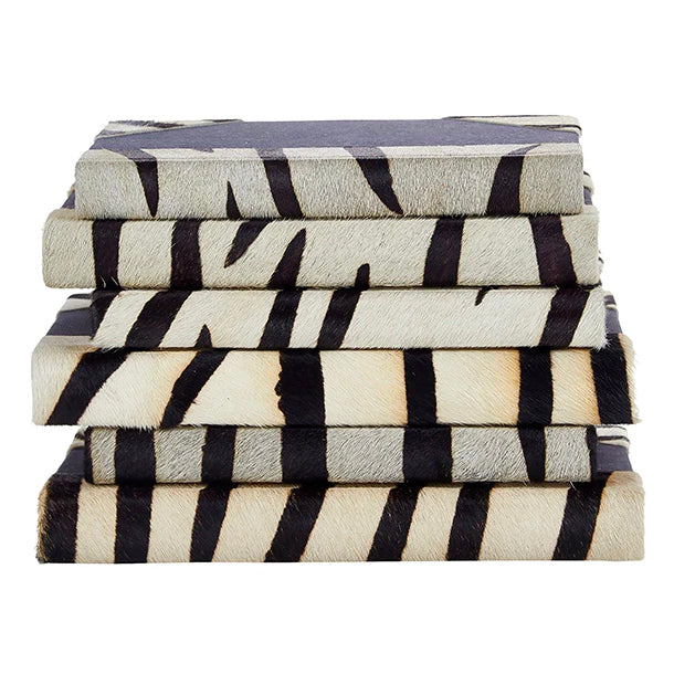 These decorative books feature zebra stencil on hide. A unique home accessory! Can be stacked as shown or vertically.