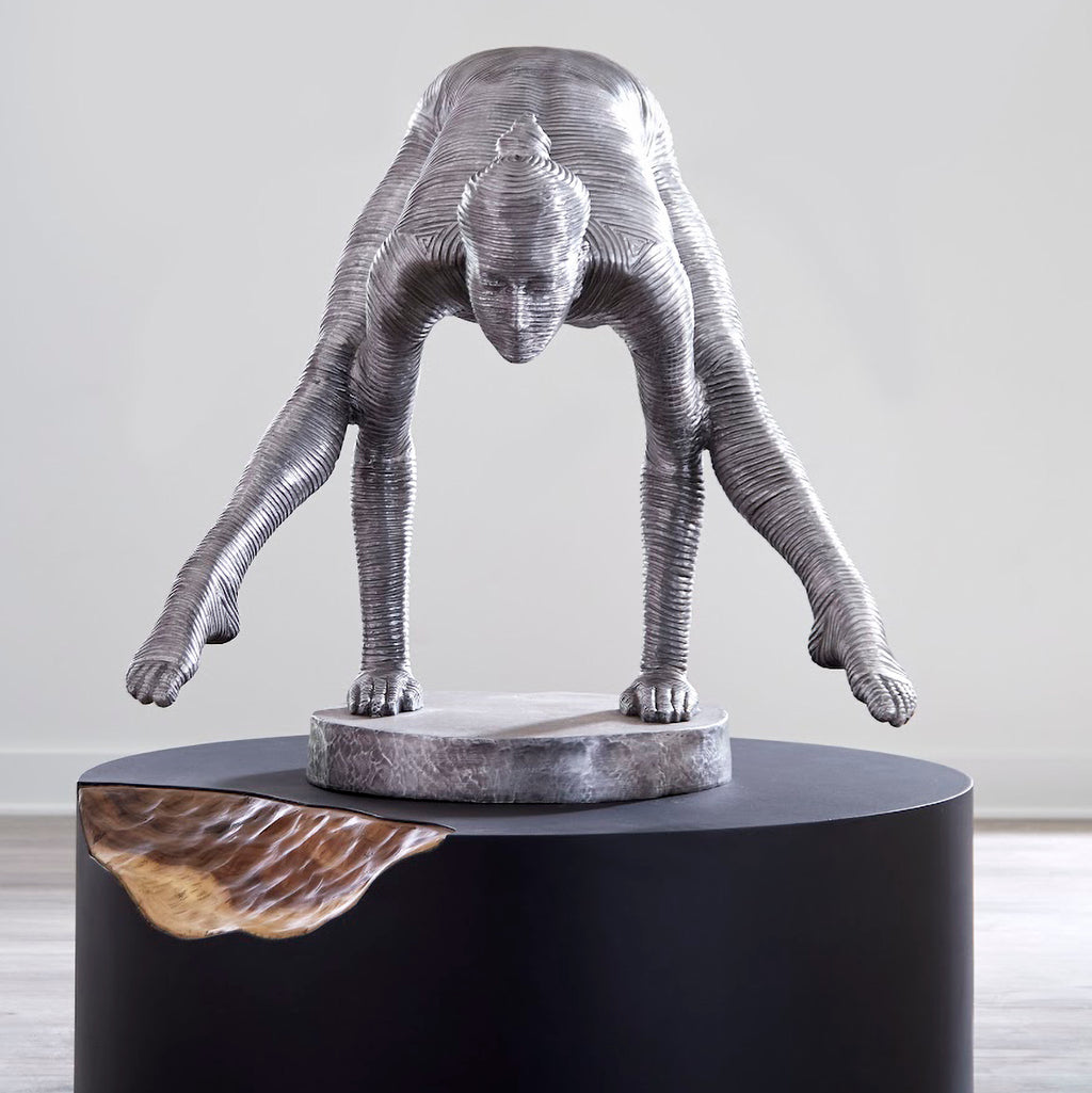 The Balancing Body Sculpture is made of aluminum in a striated surface that brings it one aspect of its design distinction: when the finish is rubbed onto its surface, it collects in the valleys to bring added patina to the gray sculpture. This lends it a textural feel that convinces the eye this is a vintage decorative accessory. In the foyer of a modern home filled with contemporary art, this decorative accessory will hold its own. We offer a number of sculptures in this family of decorative accessories.