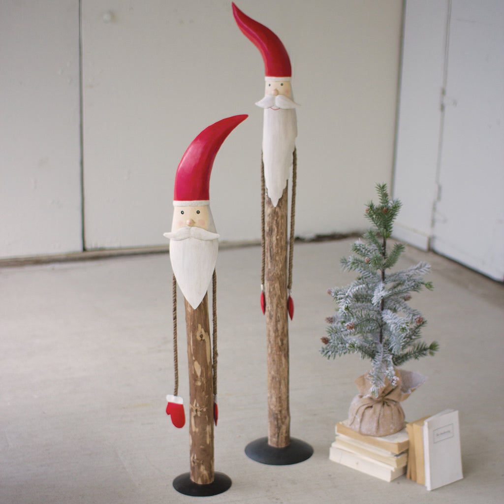 These Santa's are unique and whimsy in their design. The body is wood, the face, hat and mittens are metal and the arms are rope. They are versatile and perfect for any holiday decor.
