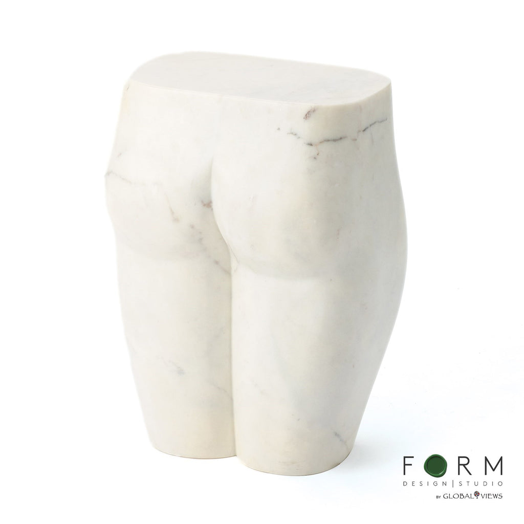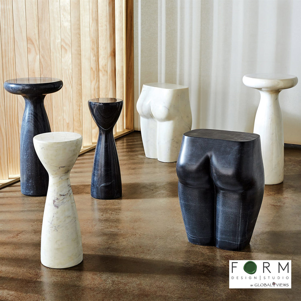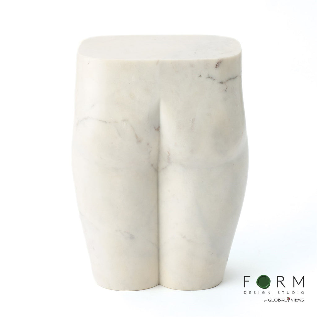 Carved from a solid piece of marble, with a beautiful honed finish, this figurative stool is sophisticated, timeless, and chic.