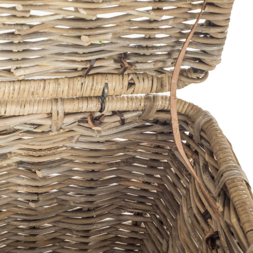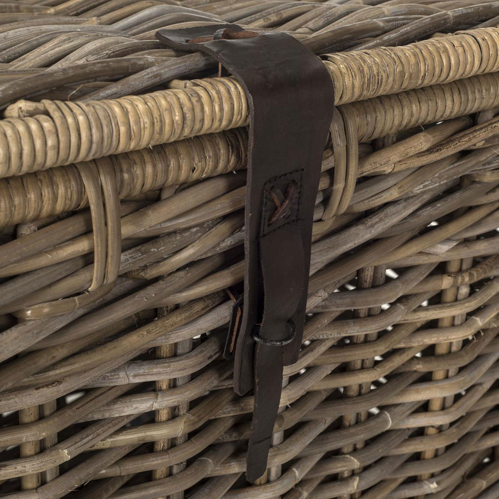 Inspired by an oversized European picnic basket, this sturdy trunk is crafted of woven kubu rattan in a pretty natural finish. With pipe iron frame for stability, it comes with removable top, faux leather straps and handles contrasting the woven rattan.