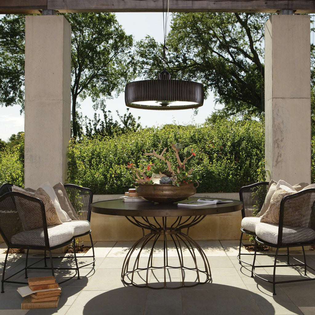 Hand-crimping the steel shade, then adding brass ribbing to the edges, gives the Studio A Crimp Chandelier its unique three-dimensional character. Includes Frosted diffuser and bronze canopy.