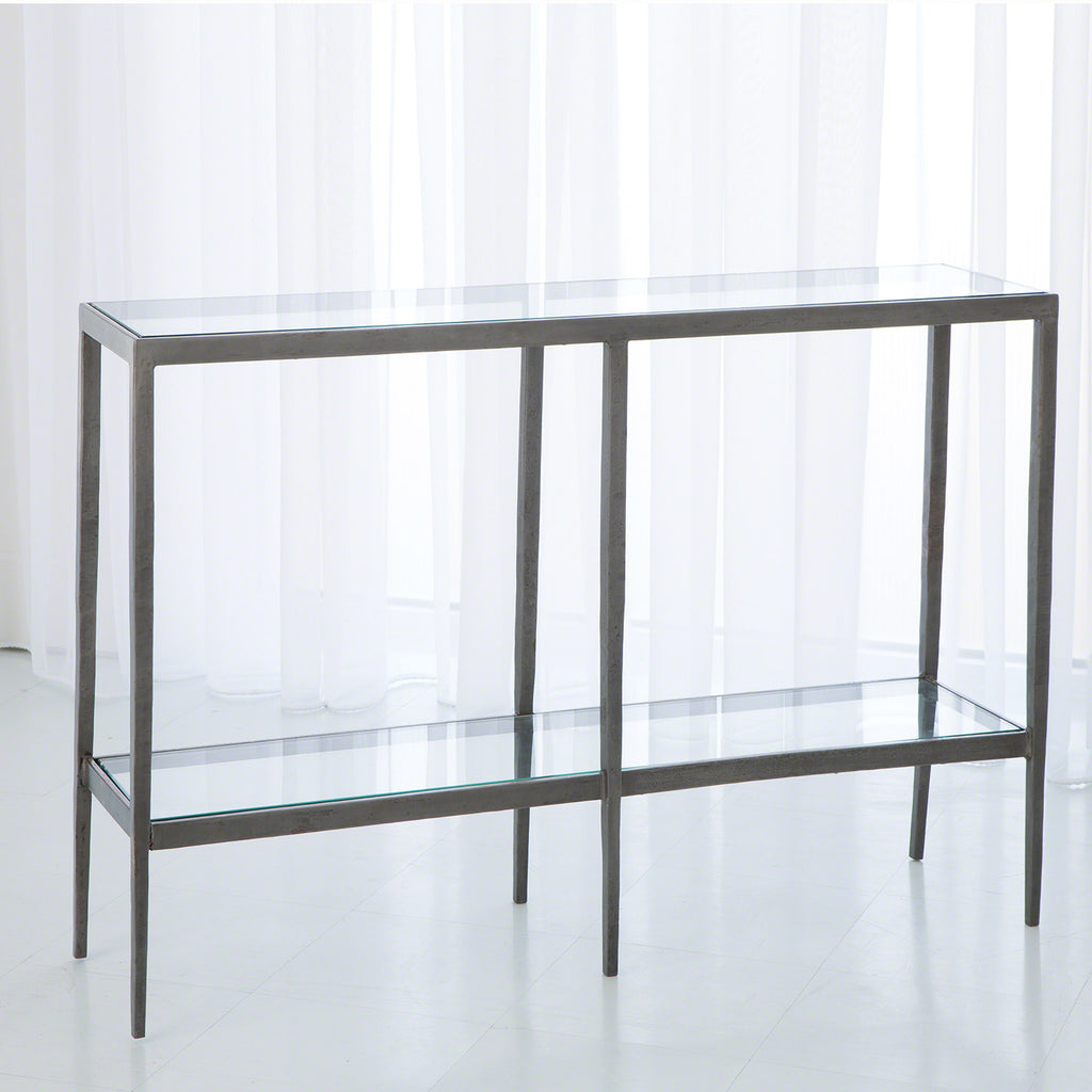 The Studio A Laforge two-tier iron console table has a clear glass top and bottom shelf. Available in antique gold or iron & brass.