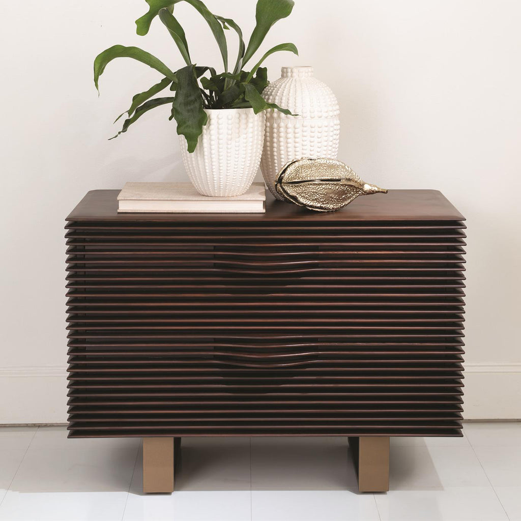 Slats of solid wood are indiviually hand laid to create a modern and luxurious presence. Fluid undulations serve as handles for 6 pull out drawers that open to roomy storage space. Sturdy metal legs provide a lift for a modern feel.