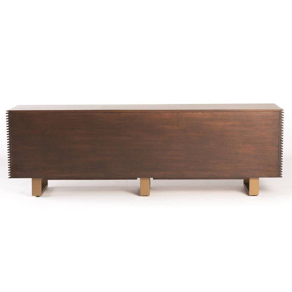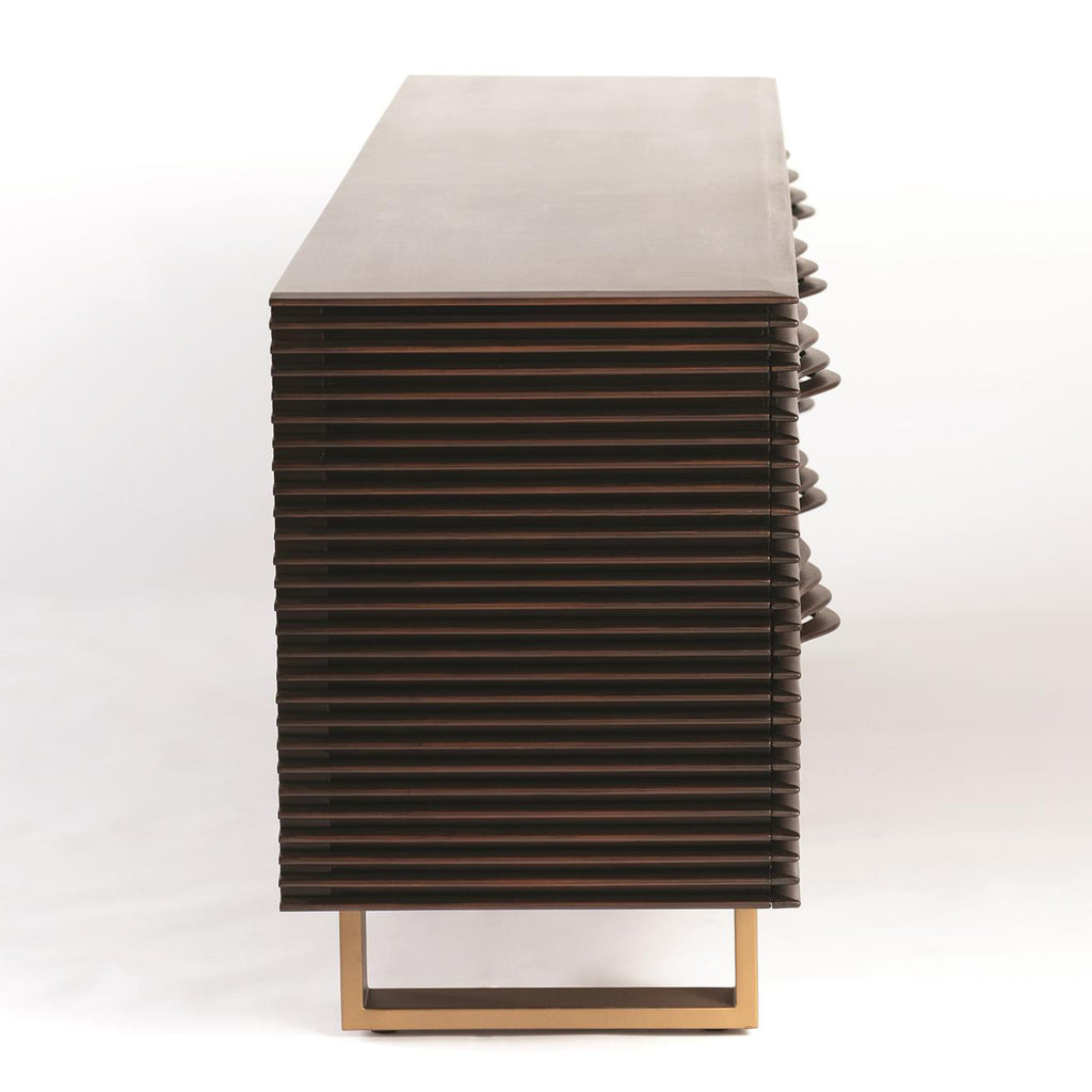 Slats of solid wood are individually hand laid to create a modern and luxurious presence. Fluid undulations ingeniously serve as handles for 6 pull out drawers that open to roomy storage space. Sturdy metal legs provide a lift for a modern feel.