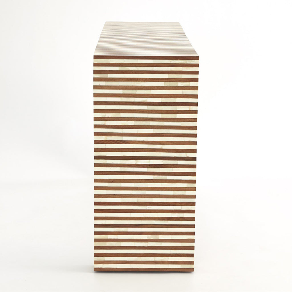 The Sienna Collection pattern is made by alternating walnut wood, bone, and mango wood. Natural lacquer finish.