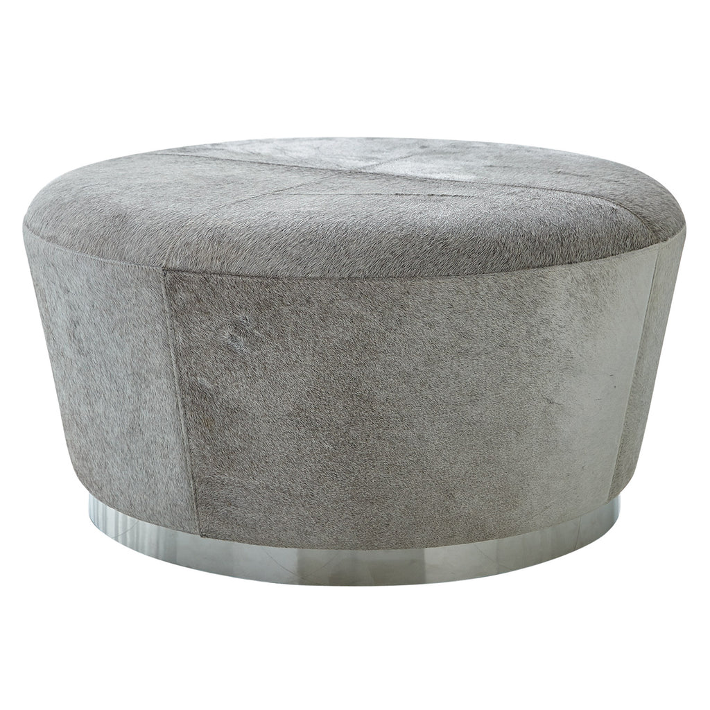 The Studio A Tapered a cocktail table-sized hair-on-hide ottoman that is functional as well as beautiful. Use it for seating, as a coffee table with a large tray, or just put your feet up! Grey hair-on-hide; top stitching. Nickel-finished trim.