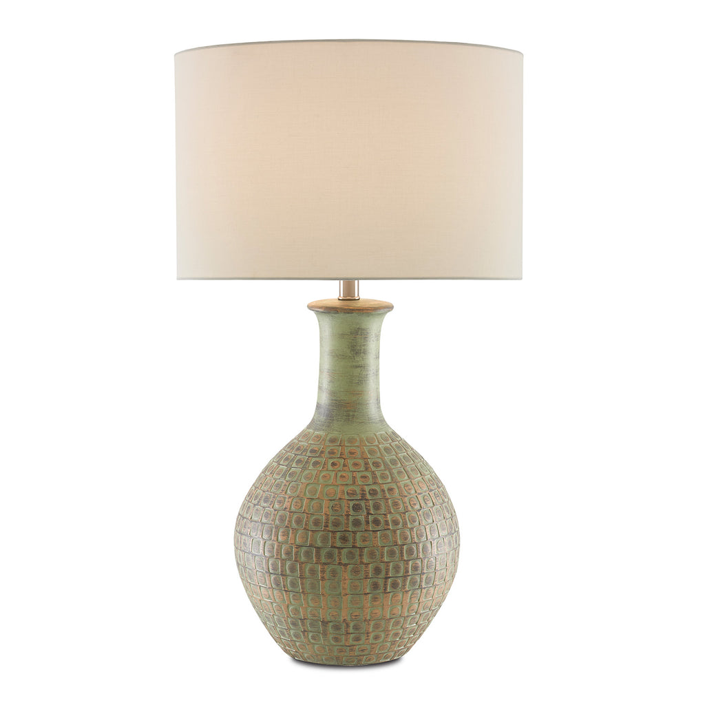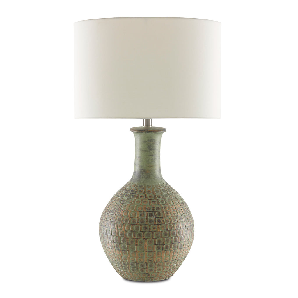 The Currey & Company Loro Table Lamp is made of terracotta with a distressed dark moss green and gold surface. Stamped into the body of the green lamp are artful squares to bring it a textural appeal. The Loro is topped with an ivory shantung shade.