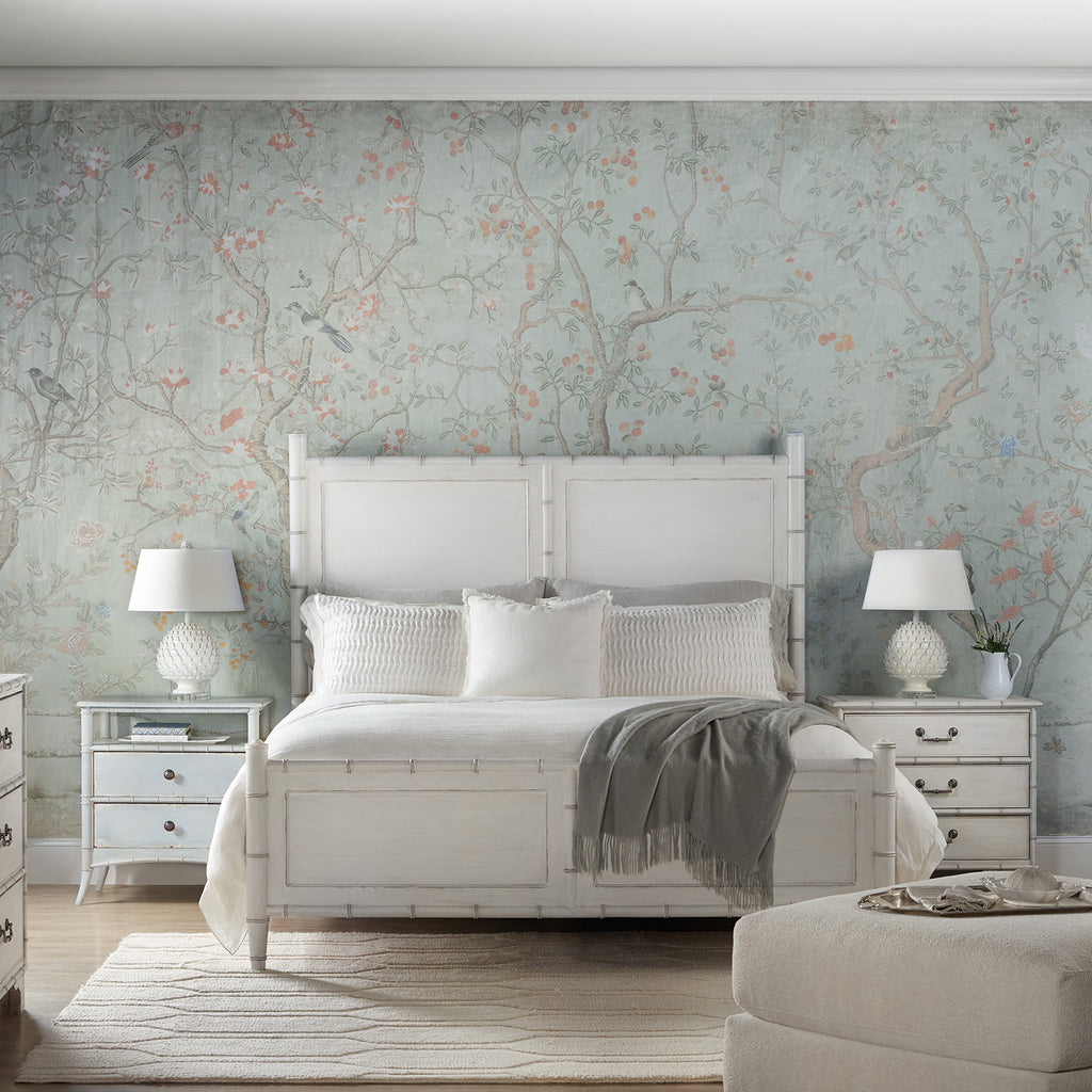 Inspired by the tropical craftsmanship of the West Indies and the cane accents of the classic British and Dutch Colonial design periods, the Charleston Nightstand has bamboo-motif trim and three drawers with self-closing drawer guides. The wood nightstand is finished in White Heron, a softer interpretation of the classic Southern limestone white with a slightly brighter sheen, delivering an heirloom-quality finish. The drawer interiors are painted gray, and the exteriors have antique pewter-colored decorative bail pulls.