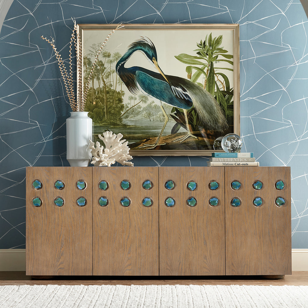 Whimsical and organic, the Pilea Entertainment Center is crafted of Oak Solids and Veneers with a light natural finish accented by inset green ceramic pulls in a lily pad design. Measuring 80 inches wide by 18 inches deep, it has four doors with soft-close hinges and touch latches. There’s one adjustable wood shelf each left and right door and one adjustable shelf the center pair of doors. Features wire management and a ventilated back panel all doors.