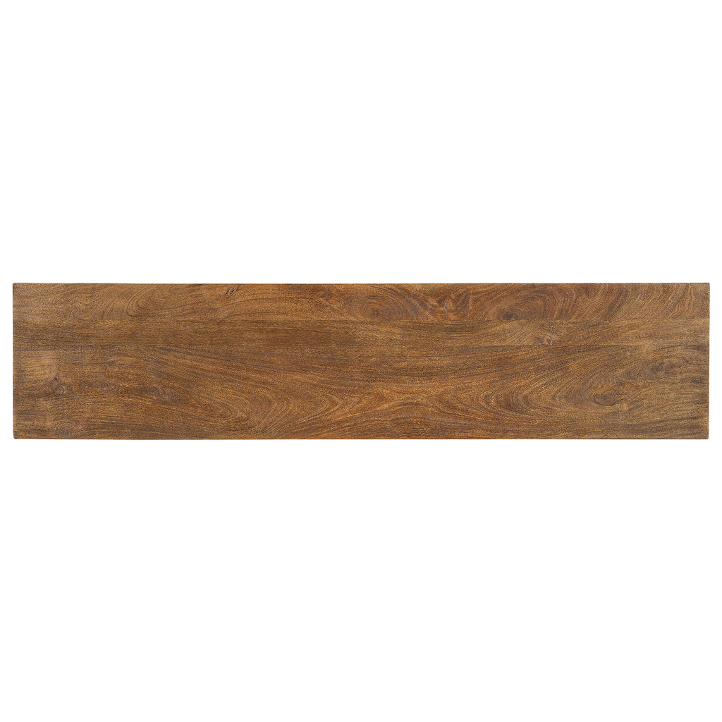 In a classic black and white color scheme with a casual modern twist, the Linear Perspective has a natural medium wood finish over Mango Solid Wood accented by black and white bone inlay on the door fronts and a black metal base. The 4 doors have soft-close hinges and touch latches and one removable shelf is each pair of doors. A ventilated back panel with wire management makes the credenza media-friendly.