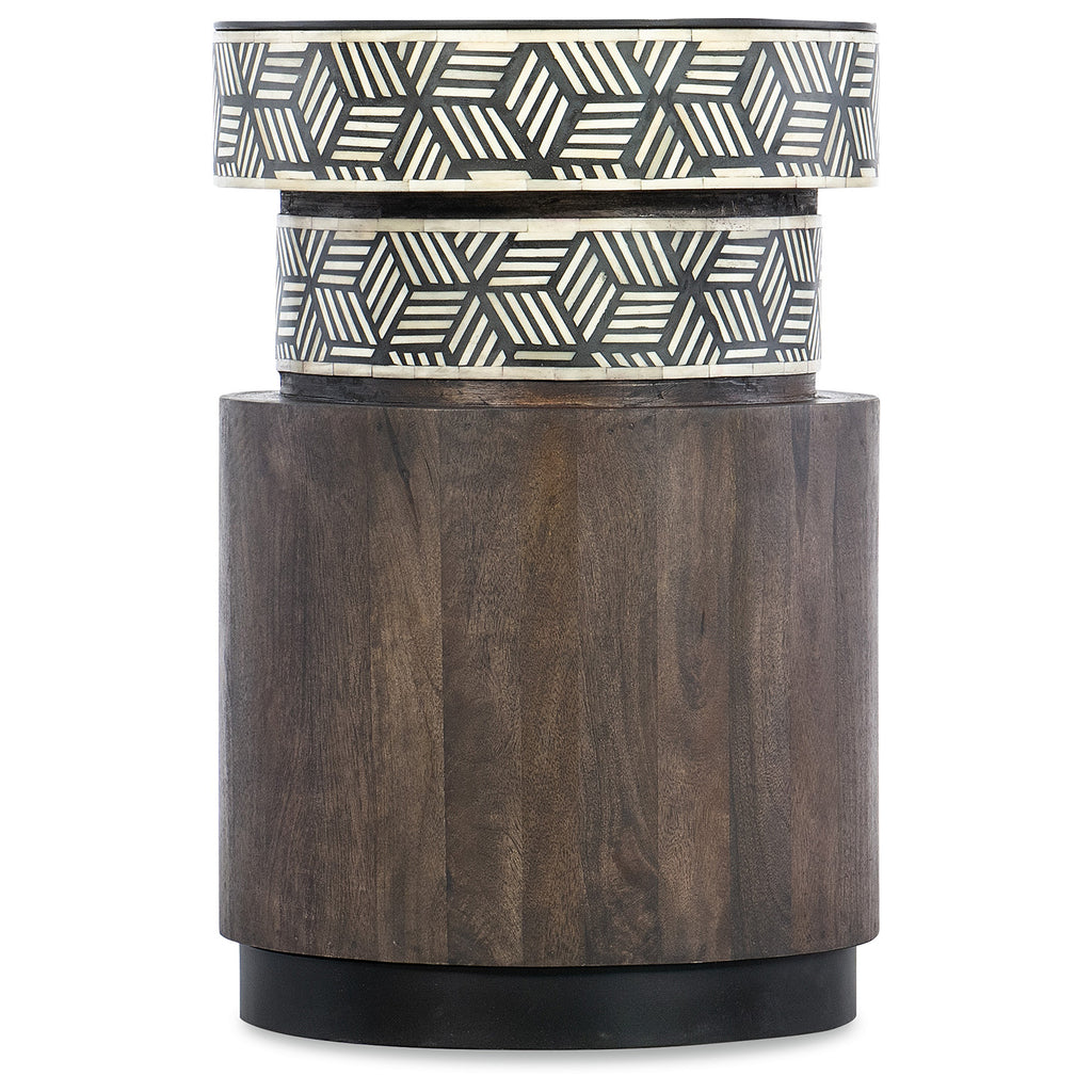 Exotic, eclectic and earthy, the Vector Side Table is crafted of Mango Solids and Iron with Bone Inlay on the top two sections. Featuring a round shape and stepped design, it has a natural dark wood finish with black and white bone inlay on the top two sections with a black top.
