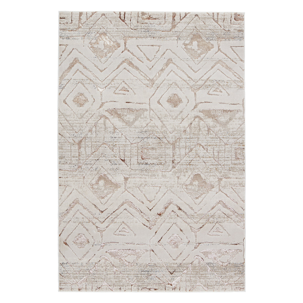 The Malilla by Nikki Chu showcases a glamorous, eye-catching sheen that boldly complements the globally inspired motifs. The captivating geometric design of the Kalindi rug anchors a space with patterned panache, while the neutral cream, gray, taupe, and bronze color offers a grounding tone to any style decor. This power-loomed rug features metallic polyester fibers blended with stain-resistant polypropylene for a brilliant luster from various perspectives.
