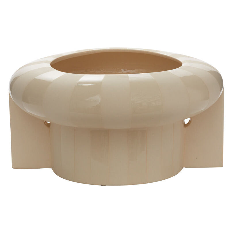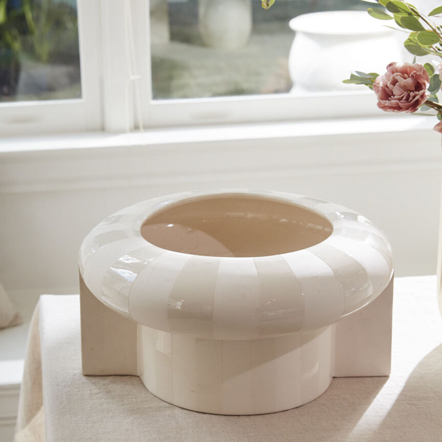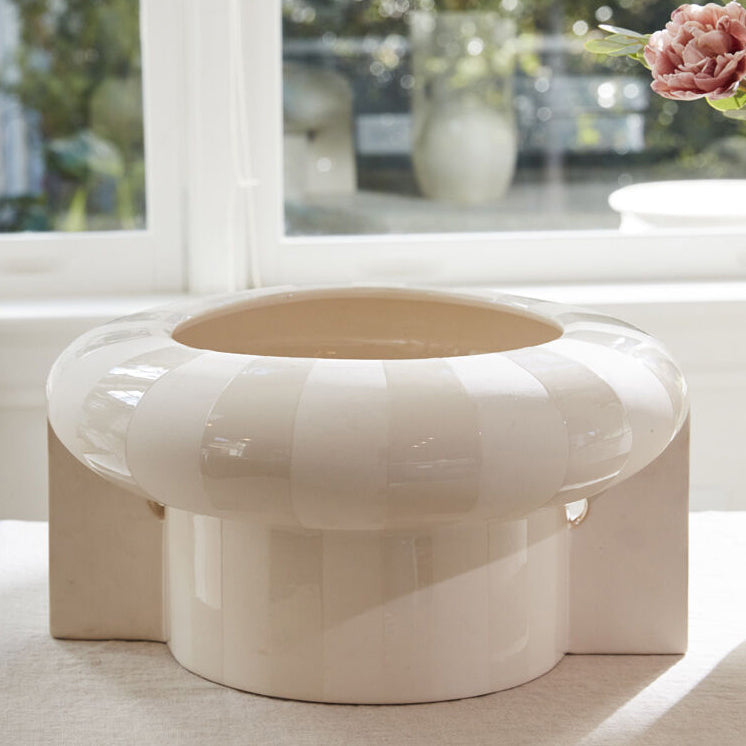 The thoughtful design of the ceramic Replay Footed Bowl offers endless creative possibilities, whether used as a decorative centerpiece, floral vessel, or planter. This versatile, watertight, uniquely shaped bowl features an open foot to support long stems, wide handles for modern flair, & alternating glossy & matte stripes on the natural white clay. With its neutral colors & interesting shape, this bowl adds eye-catching dimension to any space.