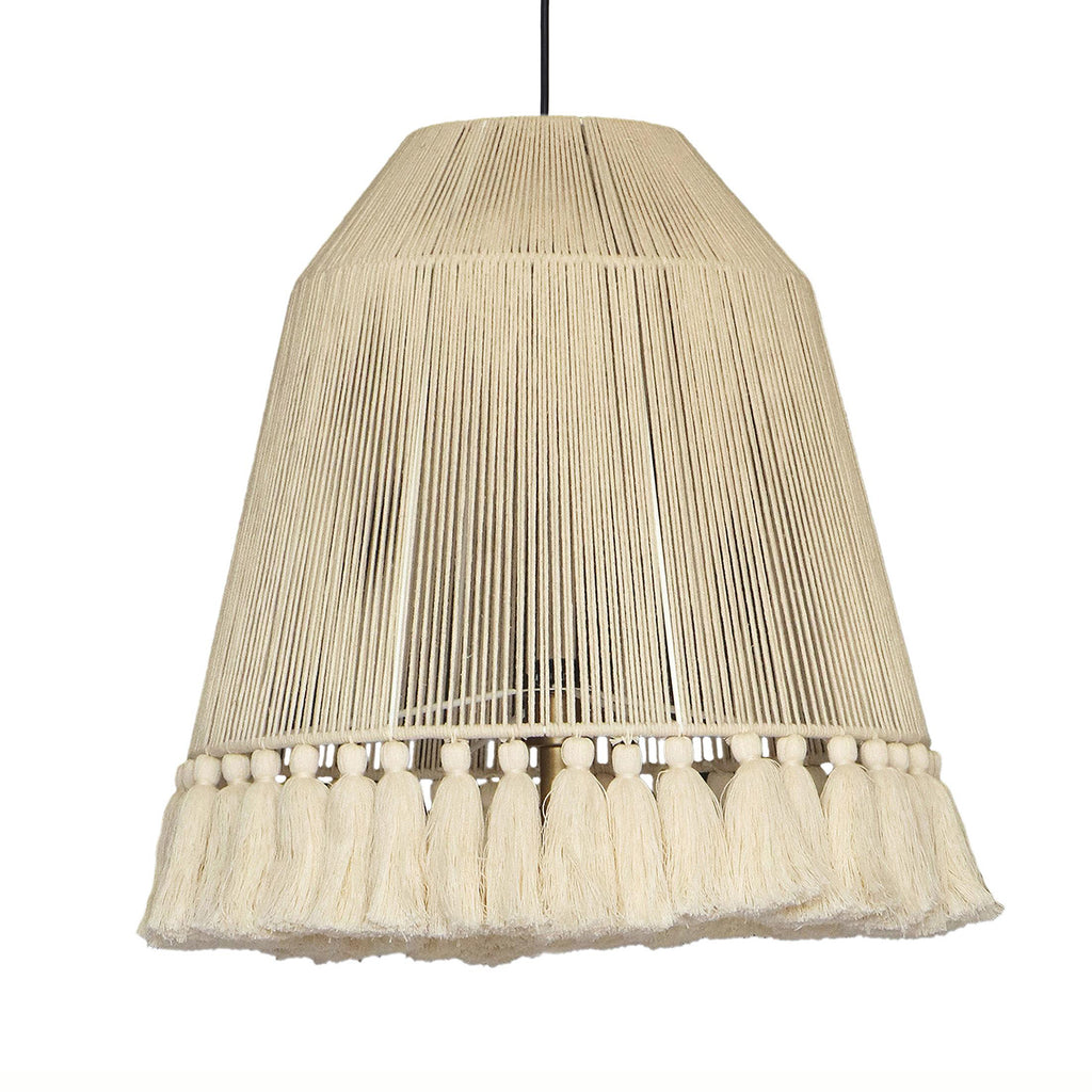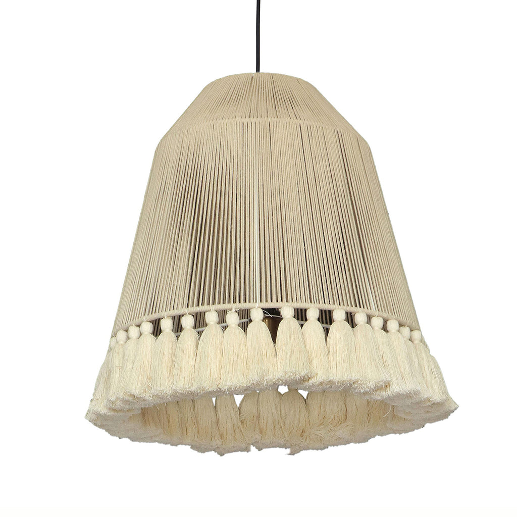 The Helen White Cotton Tasseled Pendant Lamp is a stylish and trendy lighting fixture that is designed to add a touch of bohemian flair to any room of your home. The lamp's white cotton shade is adorned with tassels, creating a visually stunning and playful look. Available in 2 sizes.