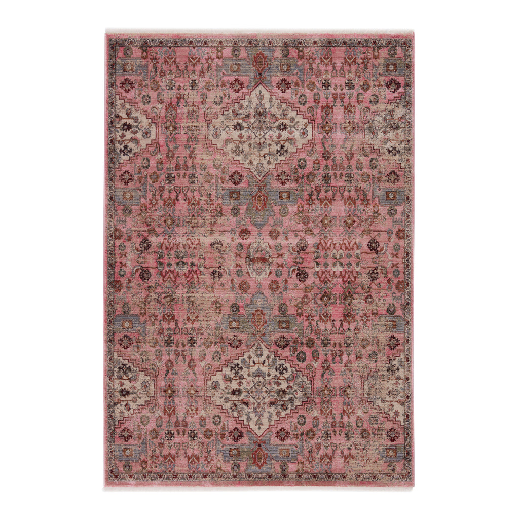 Inspired by the vintage perfection of sun-bathed Turkish designs, the Zefira collection showcases detailed traditional motifs that have been updated with on-trend, saturated colorways. The Kerta rug boasts a distressed traditional pattern in tones of pink, beige, and gray. This power-loomed rug features cotton fringe detailing, a natural result of weft yarns, that echoes hand-knotted construction and adds brilliant texture to the plush, durable polypropylene pile.