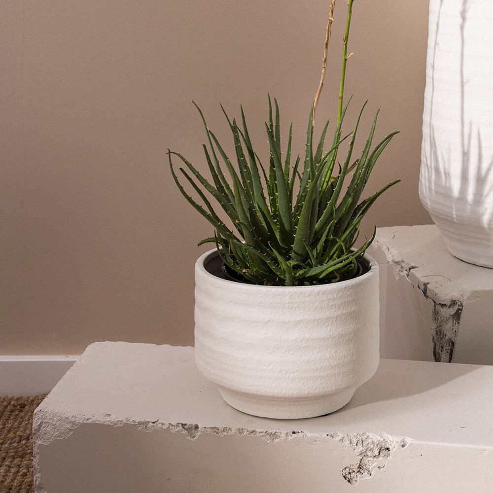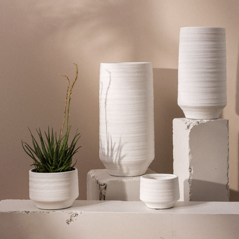 The Andrade Pot in white cement is an easy choice for modern style. With a tapered bottom, clean finish, and simple silhouette, the Andrade Pot adds a pop of clean beauty to every space.