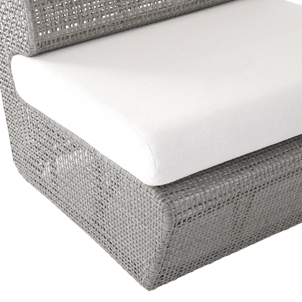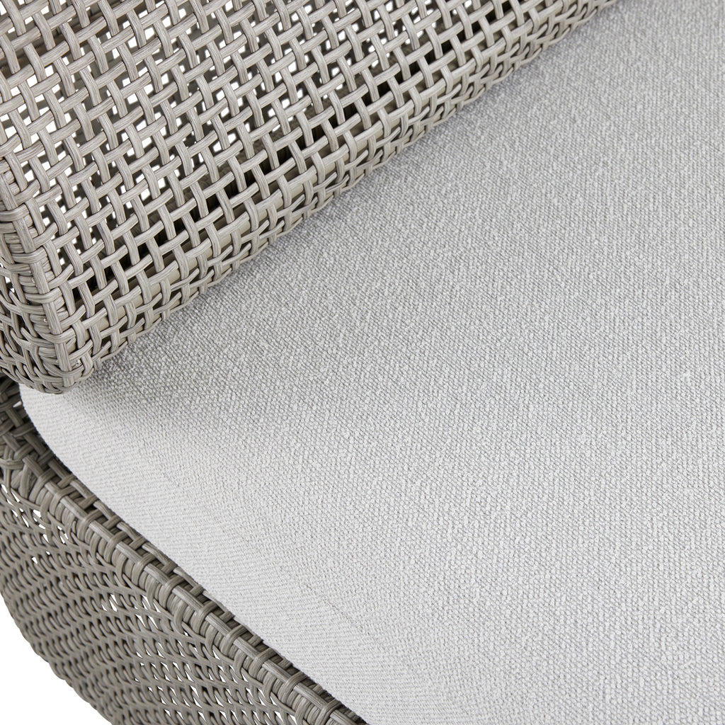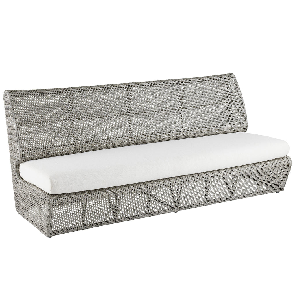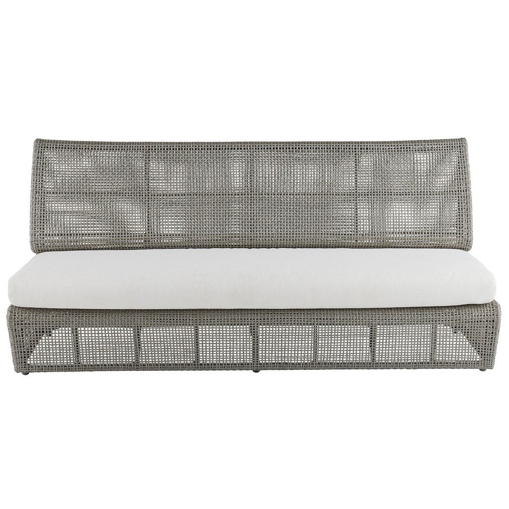 The relaxed assemblage of ’70s-style “puzzle piece” seating is revamped in our lounge-ready outdoor sofa. Composed of sturdy synthetic rattan in a weathered gray plain weave, each woven frame is accented with our pearl outdoor performance bouclé cushion. Notch detail where the cushion meets the back. Pair with the dupont chairs, or style on its own.