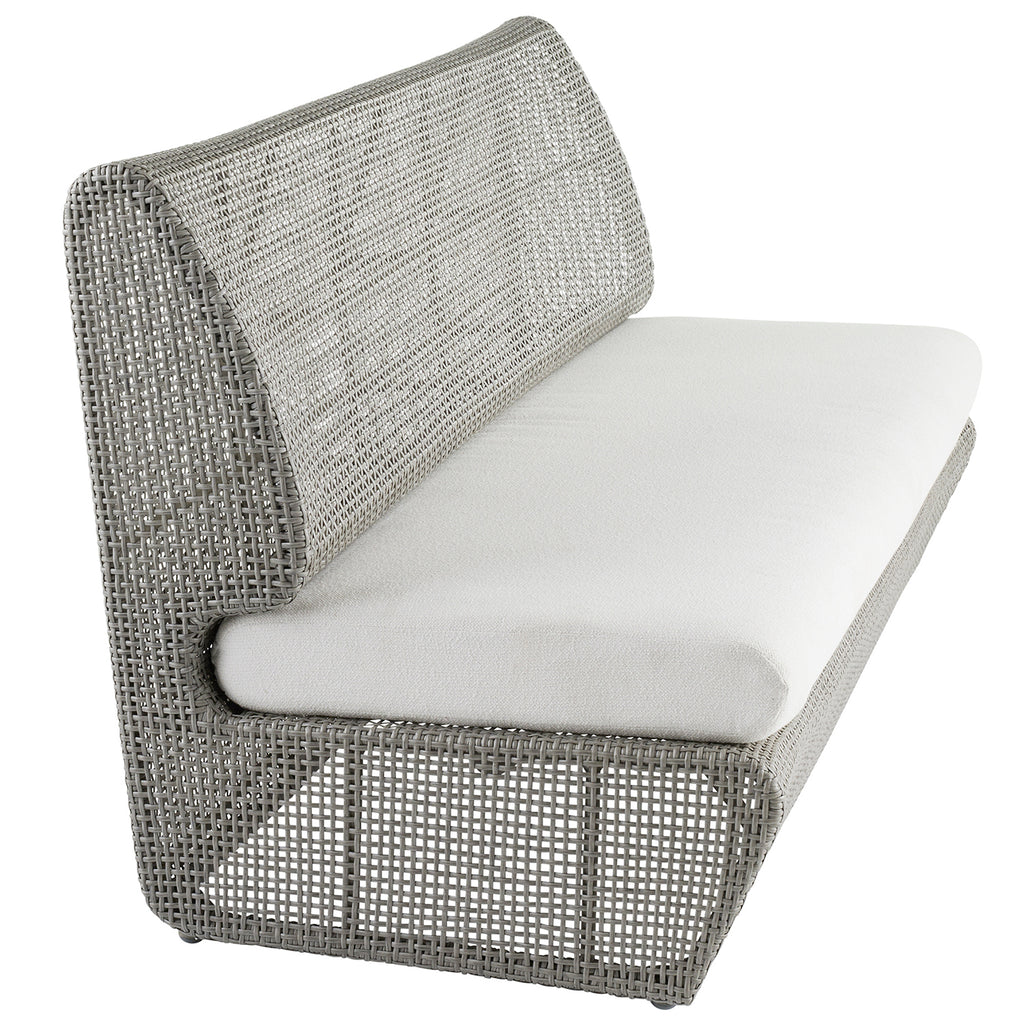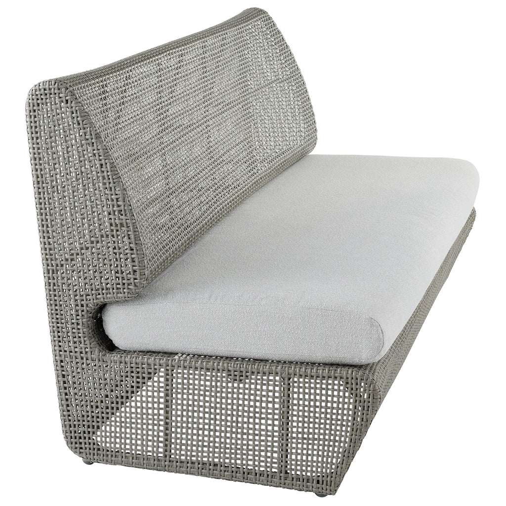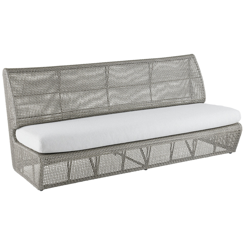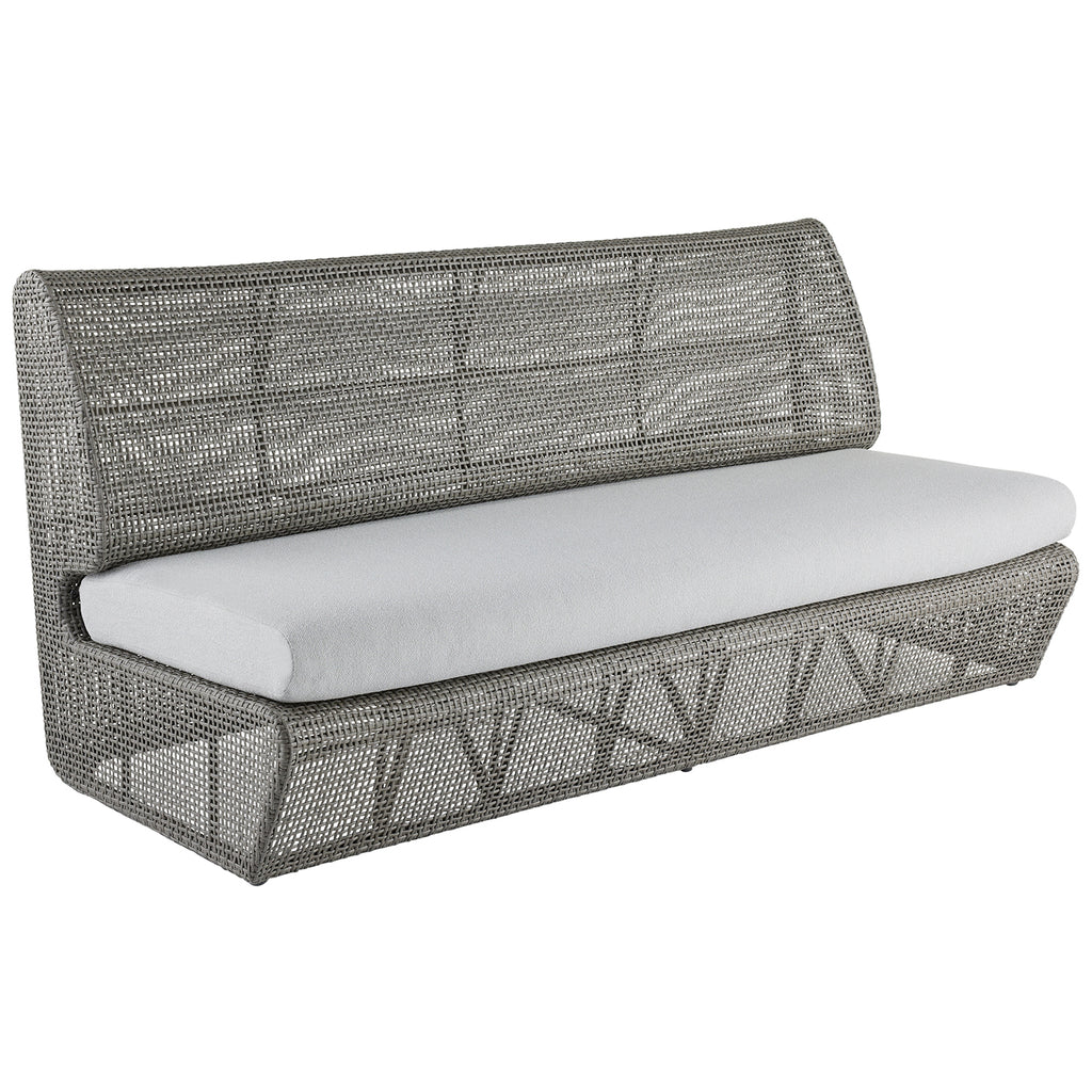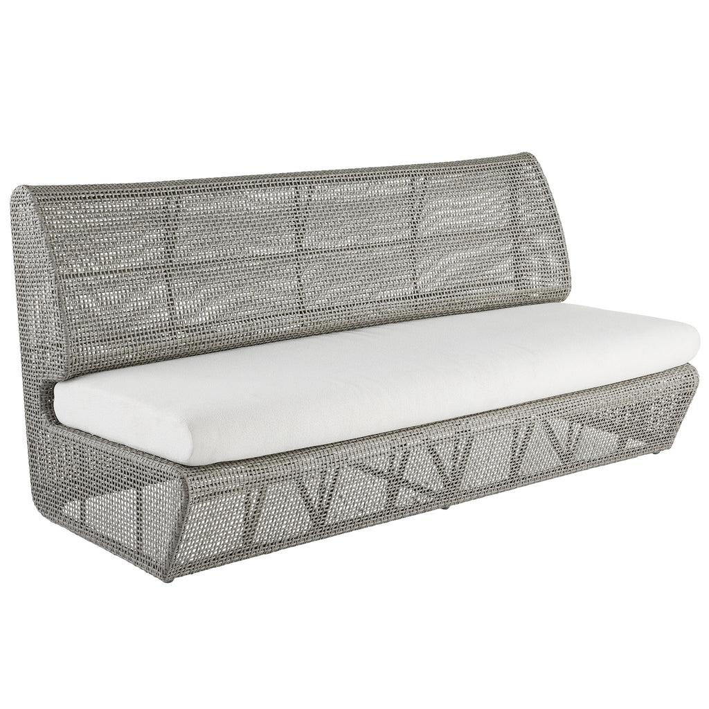 The relaxed assemblage of ’70s-style “puzzle piece” seating is revamped in our lounge-ready outdoor sofa. Composed of sturdy synthetic rattan in a weathered gray plain weave, each woven frame is accented with our pearl outdoor performance bouclé cushion. Notch detail where the cushion meets the back. Pair with the dupont chairs, or style on its own.