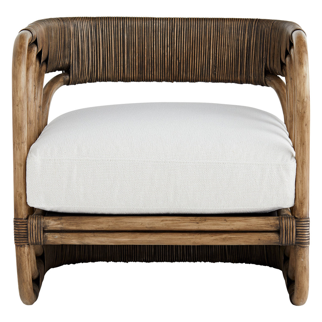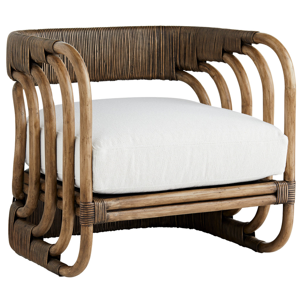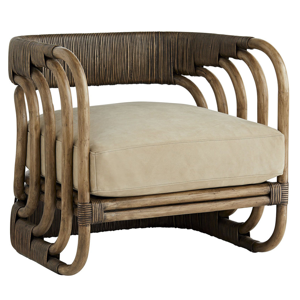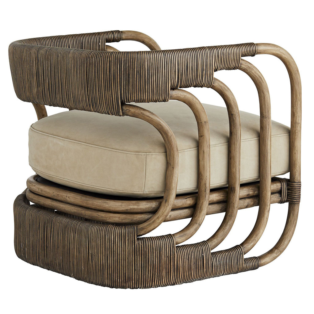 Concentric layers of thick, palm gray rattan poles frame the foundation of this elegantly eccentric and wildly organic chair. The rounded arms seamlessly flow into a tightly wrapped pencil rattan back that sits low for maximum support. A plush cushion completes the seat for extreme comfort and functionality. We've covered this one in muslin, allowing you to upholster in the fabric of your choice. Its natural aesthetic allows this piece to easily blend with existing décor. Finish will vary.