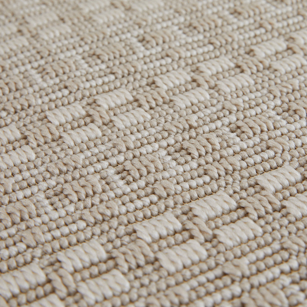 Our Arteriors Mallorca pearl outdoor rug is a beautifully dimensional pattern that adds texture and visual interest to any space. This sophisticated flatweave boasts the ultimate performance properties and is made to withstand the harshest of elements. Perfect for both indoor and outdoor usage with its integrated padded backing, the mallorca pearl is sophisticated and timeless offering a beautiful ground to build upon. Machine serged.