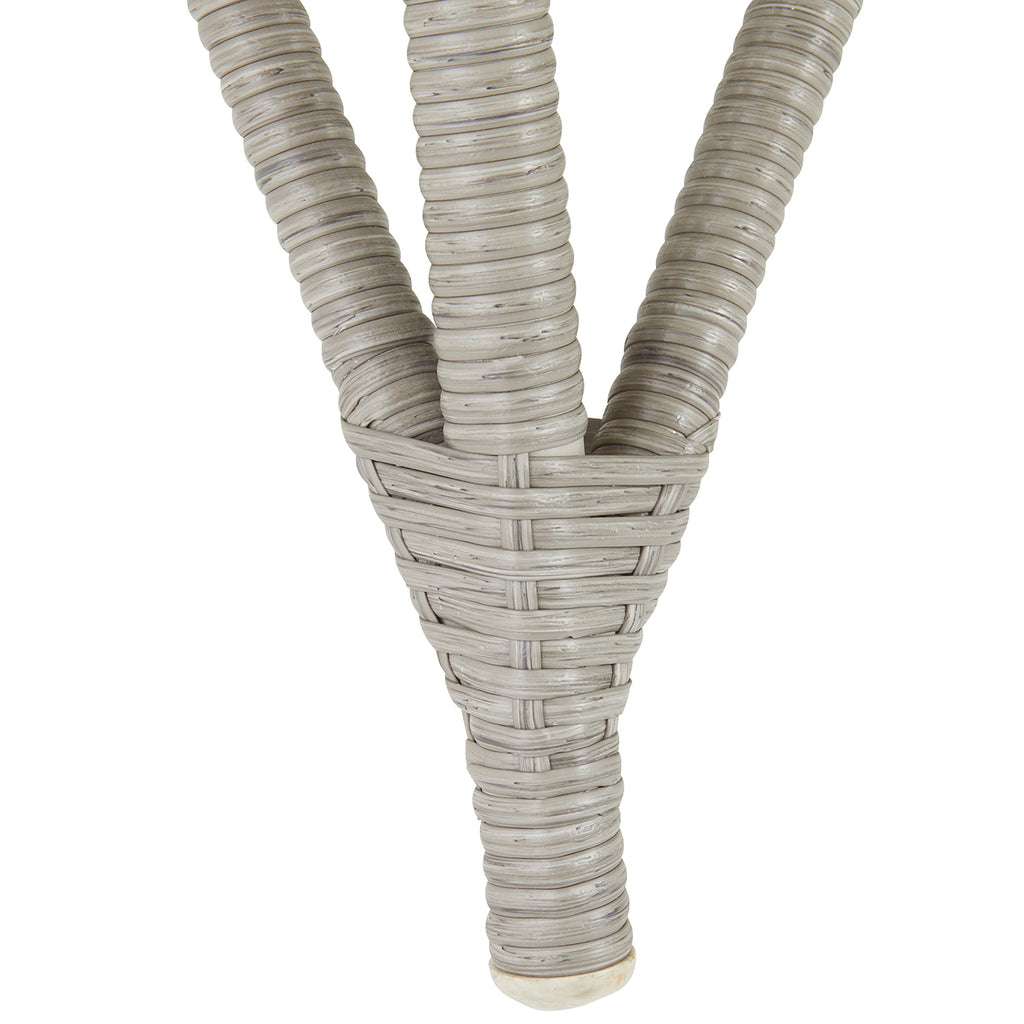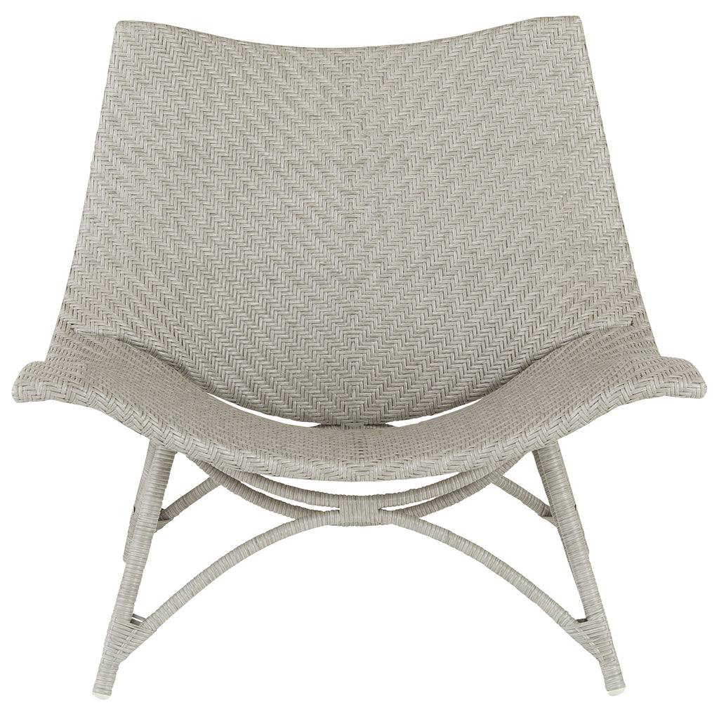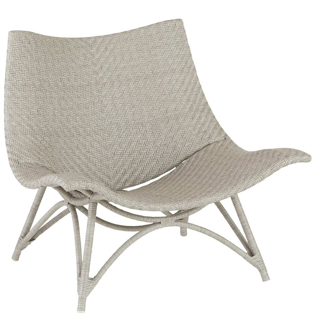 A swooping back and cradled seat give the Arteriors Margot Outdoor Lounge Chair a stylishly functional silhouette. Composed of weathered gray synthetic rattan in a twill weave, this elevated lounge chair’s lofted planes and angular legs make it both an art piece and comfortable seat. A small opening between the seat and back allows for drainage during rainy days.