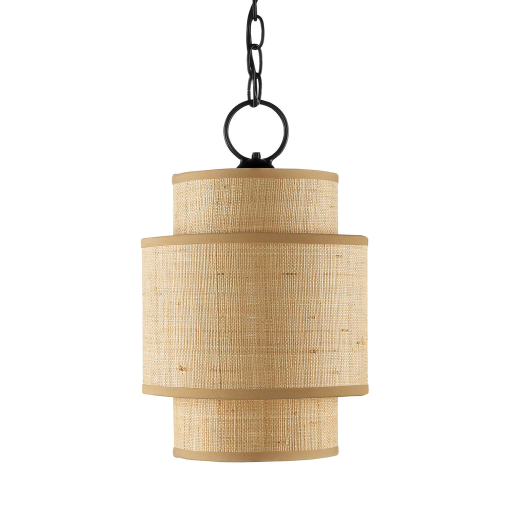 The Grass Cloth cylinders that make up the Currey & Co Mathias Natural Pendant bring an elevated design statement to the fabric shades on this tan pendant. The metal frame in a satin black finish is a contrasting element to the natural Grass Cloth shades, which are trimmed for a more sophisticated profile. Though on the surface this design is seriously simple; it is far from it, as the uniformity of the layered shades seen when looking up into the fixture is a precise effort that takes great skill.