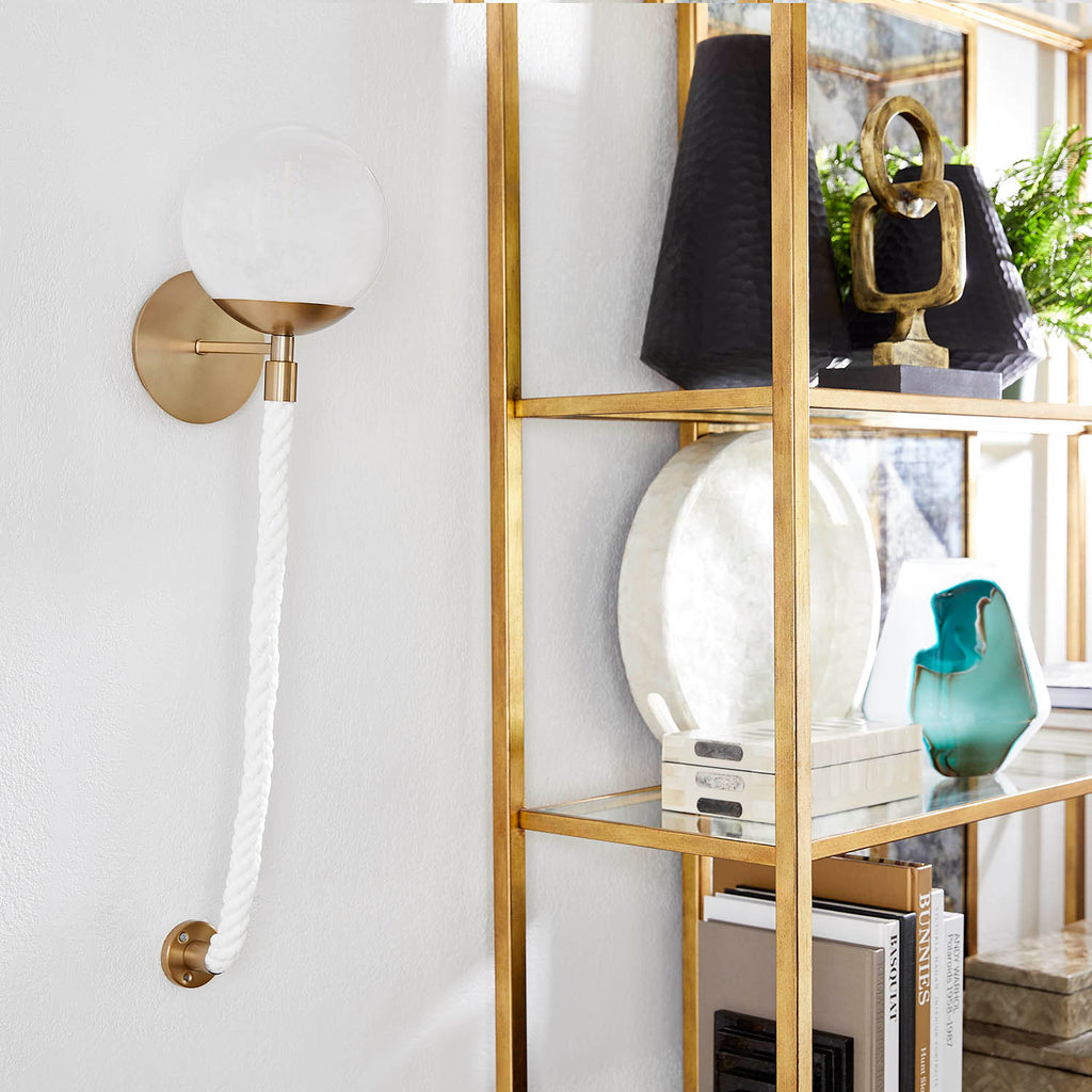 The magic of the Rockport Collection lies in the delicate, wispy, white, and smoky details that gracefully form swirling patterns inside milky glass spheres. These intricate designs capture the essence of the coastal breeze, offering a captivating and whimsical ambiance. Each fixture within this collection is a work of art, with no two alike, showcasing the exquisite craftsmanship and attention to detail. The aged brass canopy and fittings lend an air of vintage charm, while heavy white cotton rope in nautical braids extends gracefully from the glass sphere, attaching to the wall with an aged brass mounting plate.