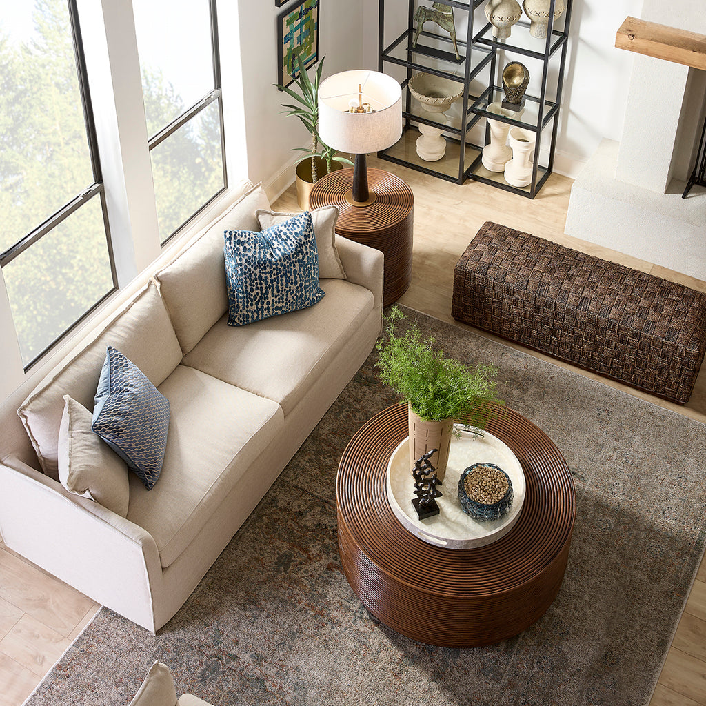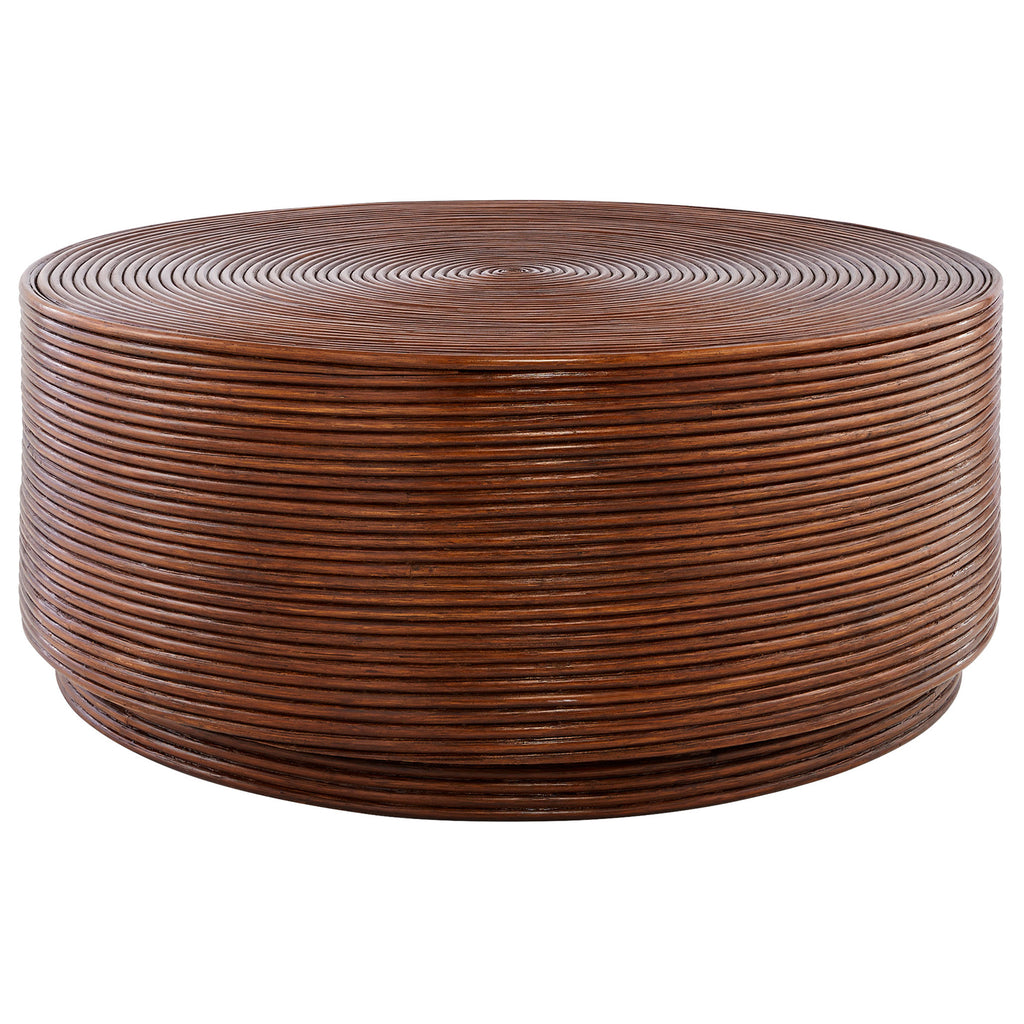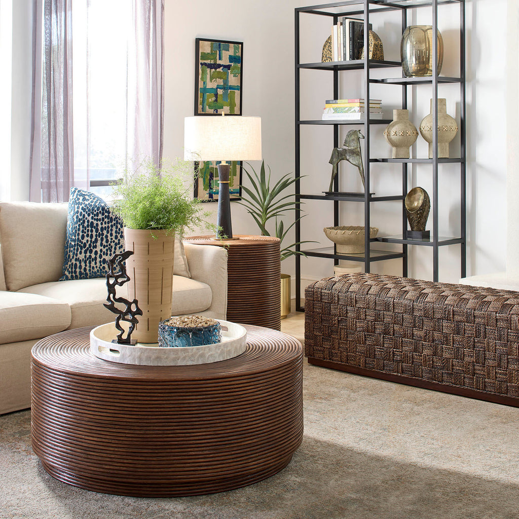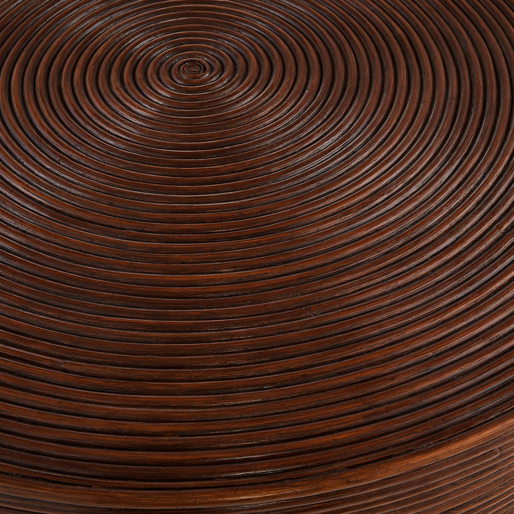 The Papeete Collection is a nod to the beauty of island life and the natural world. Named after the capitol of Tahiti, each piece within this collection features uniform walnut-stained rattan strands, tightly wound around an MDF substrate form and then coiled onto the top of the design. This intricate technique reflects the skill and dedication of Philippine artisans who handcraft these unique pieces. A walnut-stained recessed plinthe creates a cohesive design that resonates with the spirit of nature. This cocktail table is an artistic representation of the beauty of tropical life.
